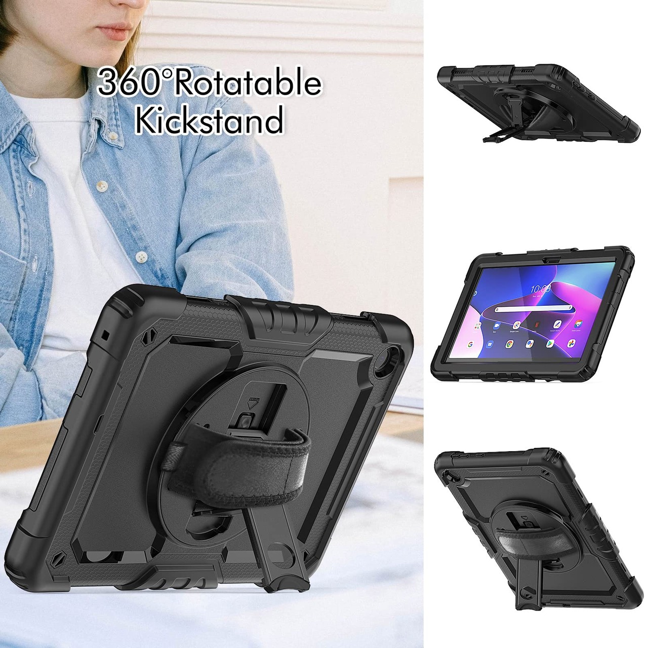 【人気商品】【MYH】For 2022モデルLenovo Tab M10 10.1インチ(TB-328F/TB-328FU/TB-328XU)ケース内蔵保護フィルム Lenovo Tab M10(3rd Gen)/ZAAE0009jp 360度回転スタンド機能付調節可能ショルダーストラップタブレットPCケース三層保護 三重構造 生活防水 耐久防塵 丈夫 頑丈 傷つけ防止 仕事 工事用 全面保護カバー(ブラック)