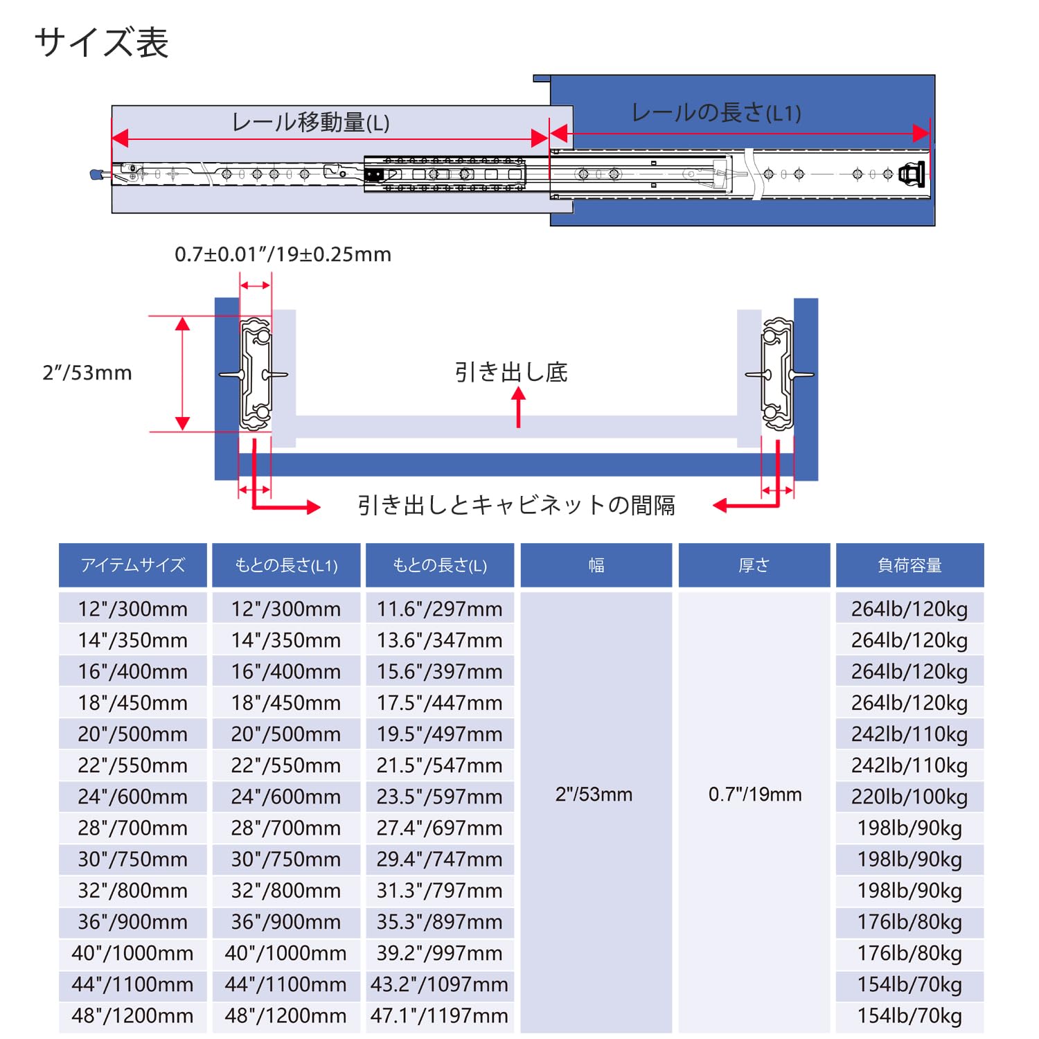 最大120kgの重耐荷重 --- #VD2053シリーズは幅53mm、厚さ2.0mmの最高品質のスチールで作られているため、耐荷重性能に優れています。 スライドレールが長くなると耐荷重が減ります。 記載されている耐荷重データの偏差が 5% 未満であれば、別の用途で許容されるとみなされます。