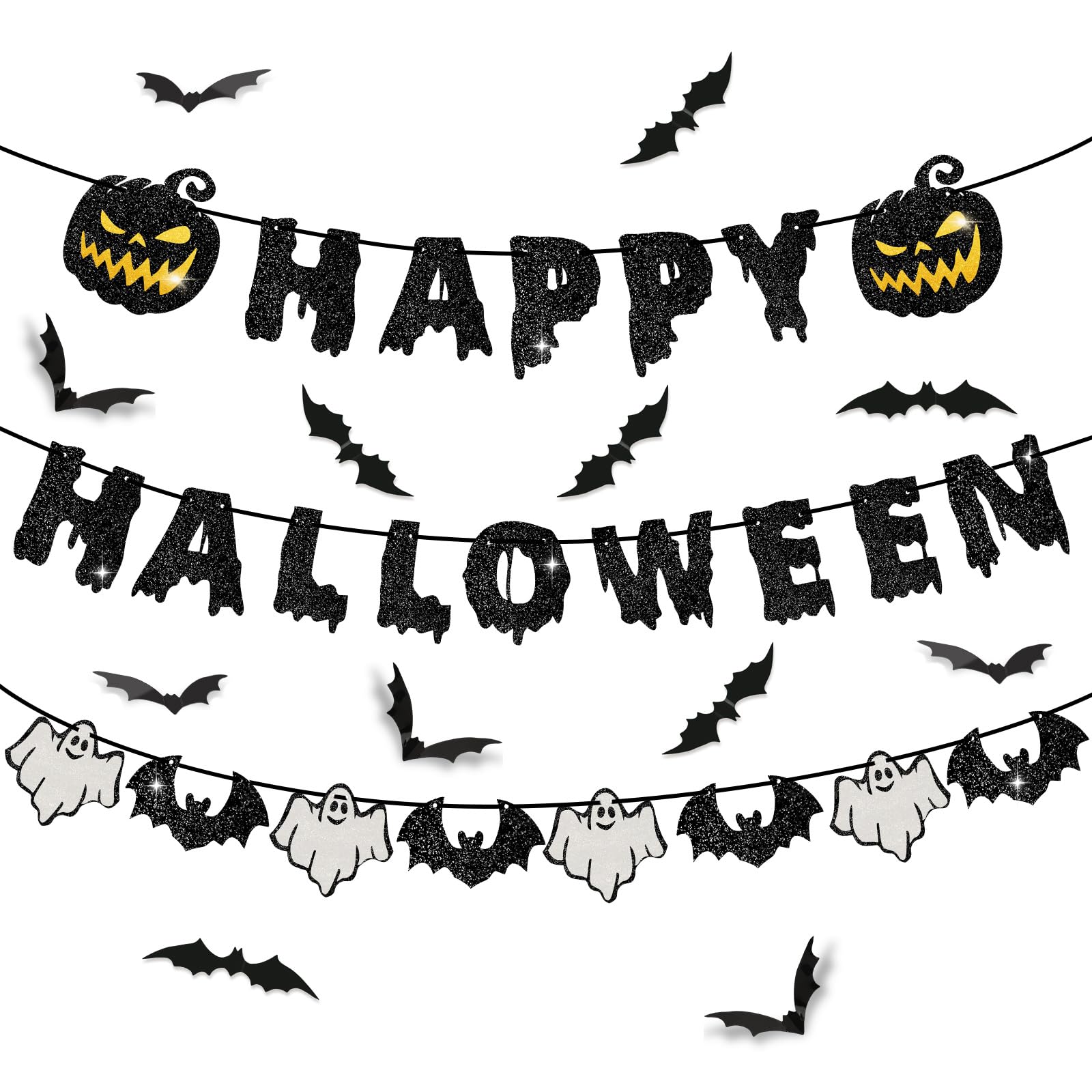 セット内容:パッケージにはHAPPY HALLOWEEN ガーランド×1、コウモリ ガーランド×1、コウモリステッカー×12枚が入っています。シンプルなハロウィン 飾りで、自宅の様々な場所で使用でき、祭りの装飾ニーズに対応しています