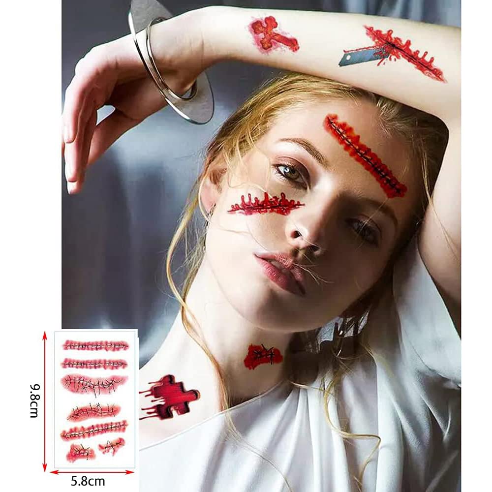 【セット内容】ハロウィンタトゥーシール30枚セットです(縫い傷、爪裂き、傷跡、眼球や蜘蛛など)