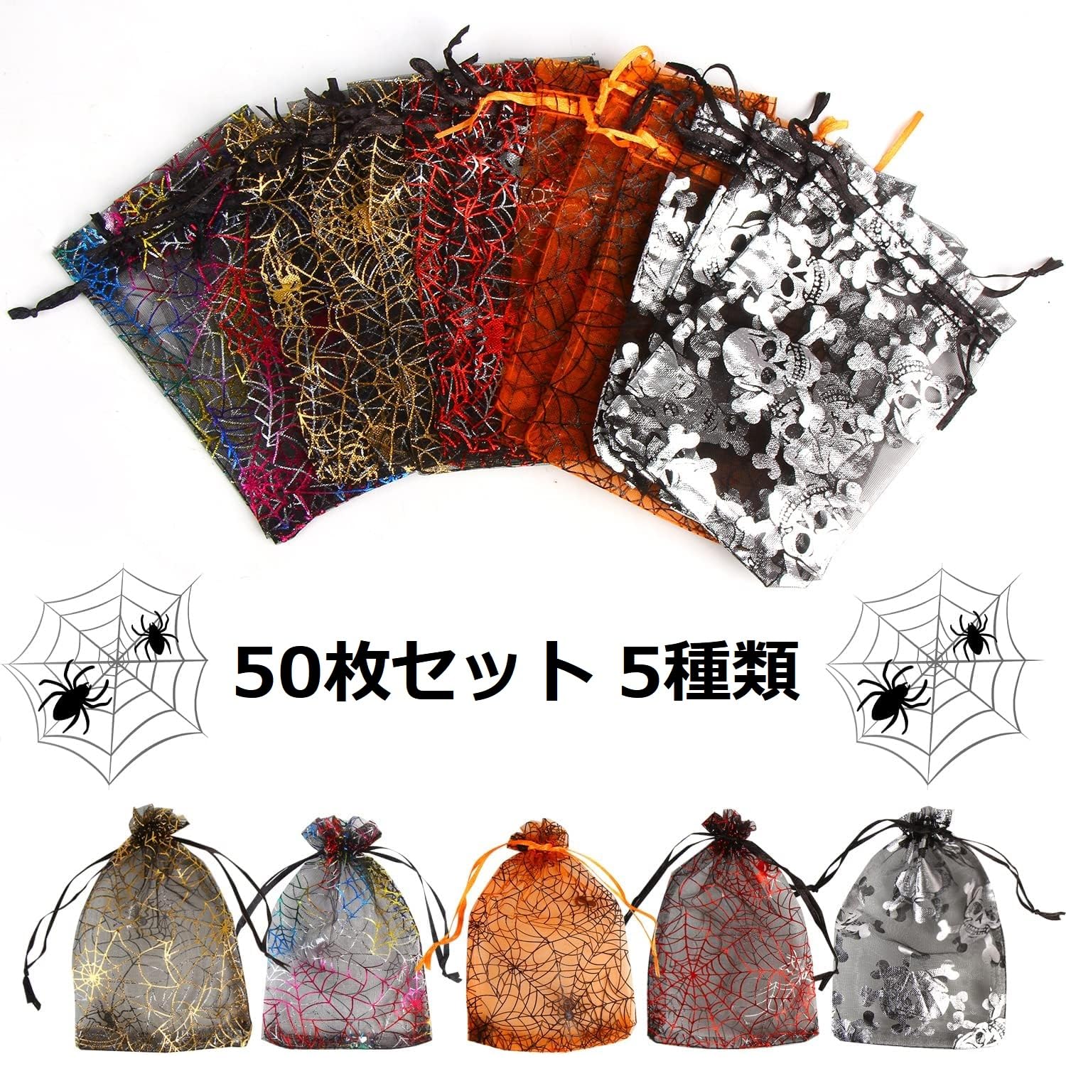 siawadeky オーガンジー 巾着袋 50枚セット ハロウィン キャンディバッグ 蜘蛛の巣 スカル柄 巾着ポーチ 混合色 ホットスタンプ ギフトバッグ お菓子 ジュエリー 小物入れ 小分け袋 ハロウィン パーティー プレゼント包装用