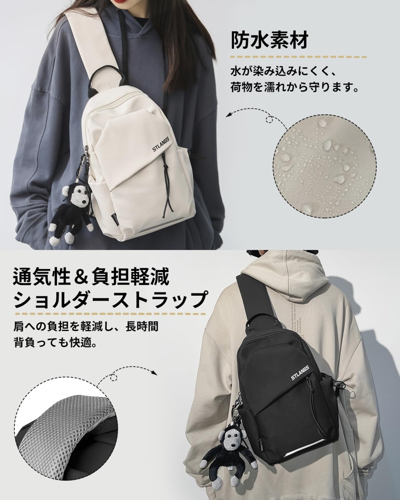 【貴重品を守る防犯ボディーバック】混雑した場所でも安心して使える背面の隠しジッパーポケット付き。スマホや財布などの貴重品を盗難から守る設計で、旅行や通勤時に便利です。日常生活でも防犯対策が万全のデザインです。