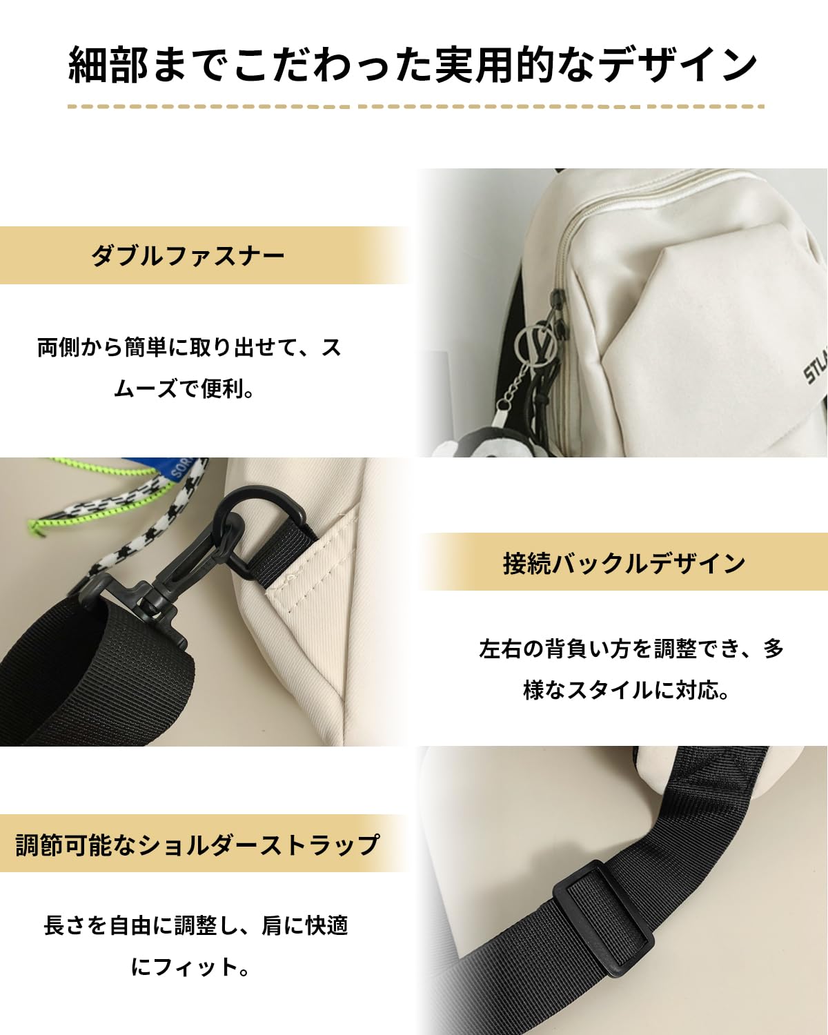 【貴重品を守る防犯ボディーバック】混雑した場所でも安心して使える背面の隠しジッパーポケット付き。スマホや財布などの貴重品を盗難から守る設計で、旅行や通勤時に便利です。日常生活でも防犯対策が万全のデザインです。