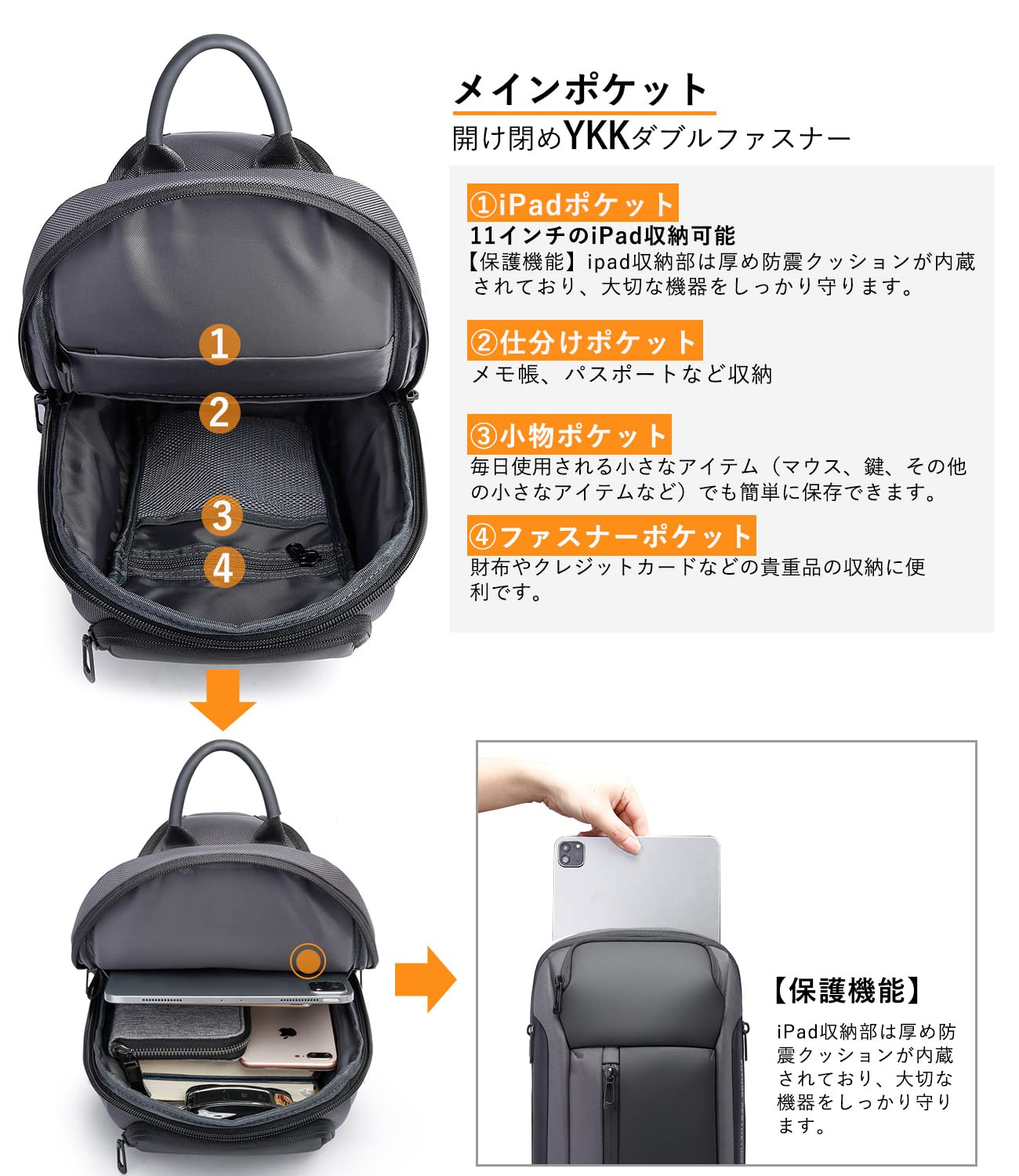 人間工学の斜めがけバッグ:前掛け、後掛け、斜め掛けなど3つの掛け方があります。両肩に付け替え可能。体にフィットするよう人間工学に基づいた設計となっております。長時間持ち歩いても疲れにくく、アクティプなお出かけにも対応。