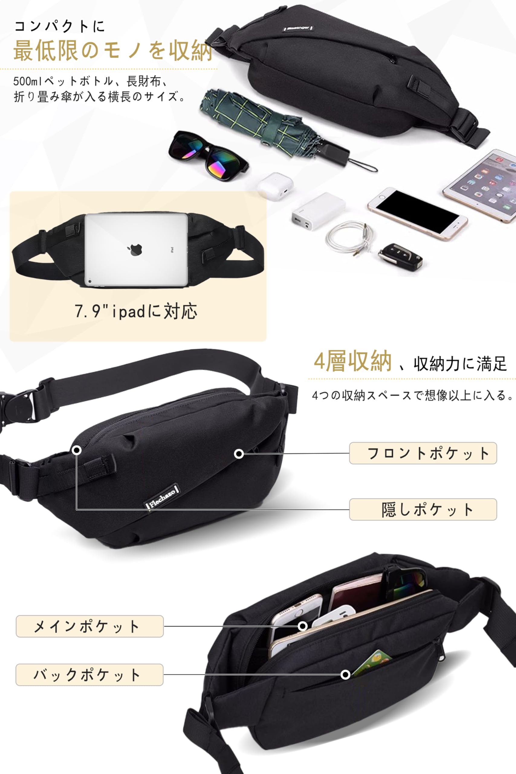 [Flechazo] 機能強化2.0]ショルダーバッグ メンズ 斜めがけ ボディバッグ ウエストポーチ セキュリティポーチ コンパクト 小さめ 軽量 スキミング防止 rfid 軽量 撥水 多機能 3way 海外旅行、通勤、スポーツに適用(ブラック)