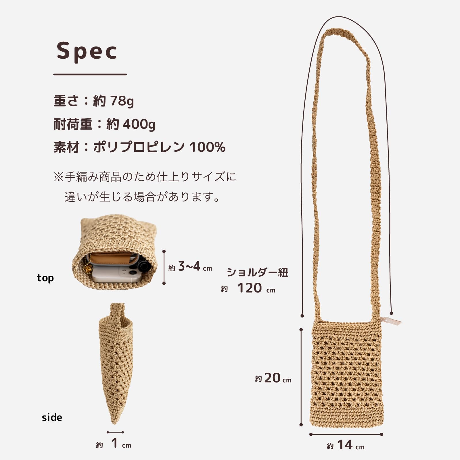 サイズ(約) 縦:20㎝ 横:14㎝ ショルダー:120cm ※手編みのため仕上がりサイズに違いが生じる場合があります。