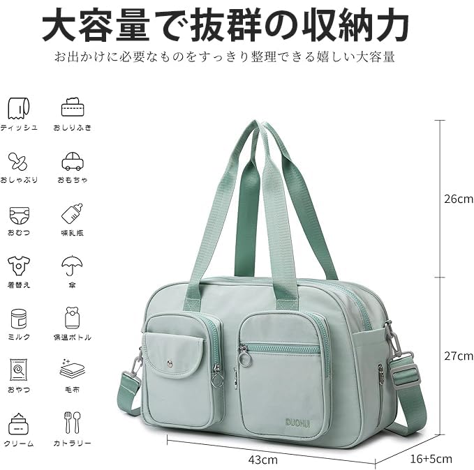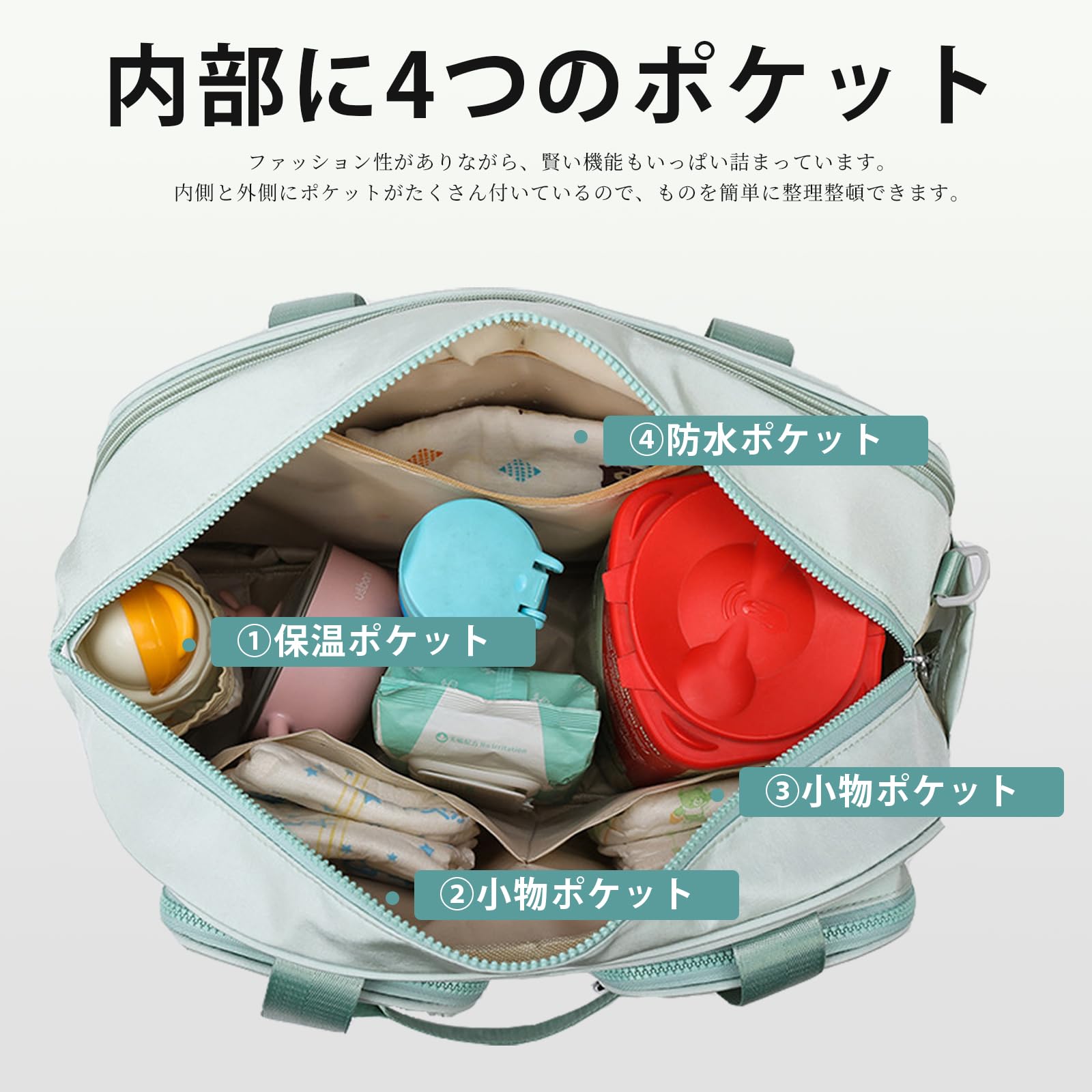 【収納力抜群!】合計10個の実用的なポケットを備えており、荷物をすっきりと整理できます。フロントにはファスナーポケットが3つと、マグネットボタン付きのポケットが1つあり、よく使う小物をサッと取り出せて便利です。バックにはスーツケースのキャリーハンドルに通せるベルト部分があり、その部分に隠しファスナーポケットを1つ配置しています。貴重品の収納にも安心です。サイドにはティッシュ専用の縦型ファスナーポケットがあり、片手でも簡単にティッシュを取り出せます。バッグのインナーには保温機能付きのポケットが1つあり、哺乳瓶や飲み物を適温に保つことができます。インナーのサイド部分には仕切り付きポケットが2つあり、衣類やおむつなどを分けて収納できます。コンパクトながら収納力が高く、育児グッズをきれいに整理できるので、外出時にも大変便利です。