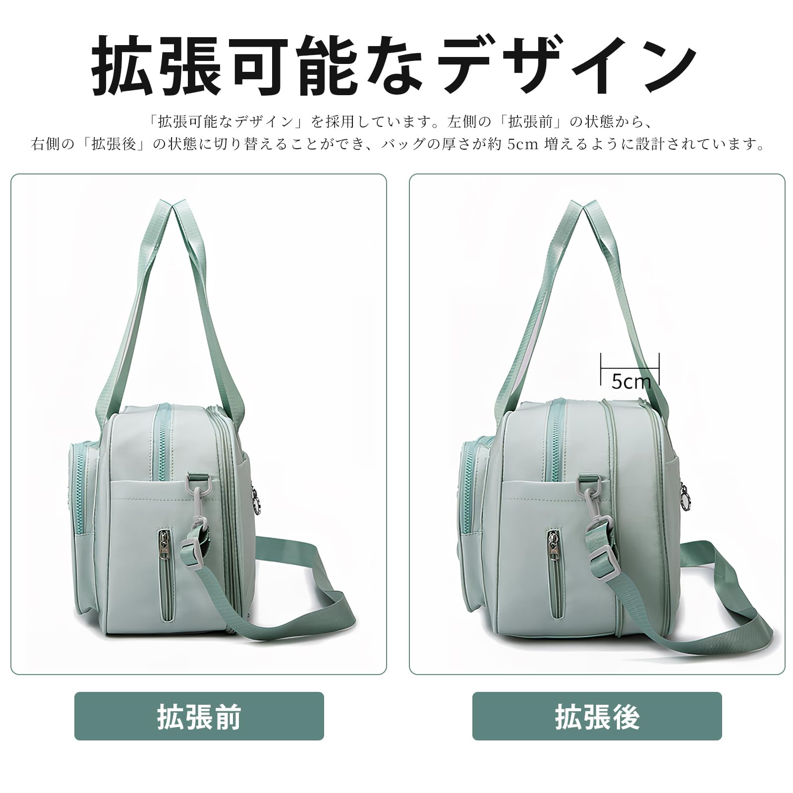 【属性情報】サイズ: 幅43cm x 高さ27cm x 厚さ16+5cm 重量: 0.58kg 肩ベルト: 116cm (調整可能) 手提げ部分: 26cm 素材: 100%ポリエステル 全5色(グリーン/カーキ/グレー/ピンク/ブラック)落ち着いた色合いとシンプルなデザインで、男女問わず使いやすいラインナップです。ファッションに合わせてお選びいただけます。