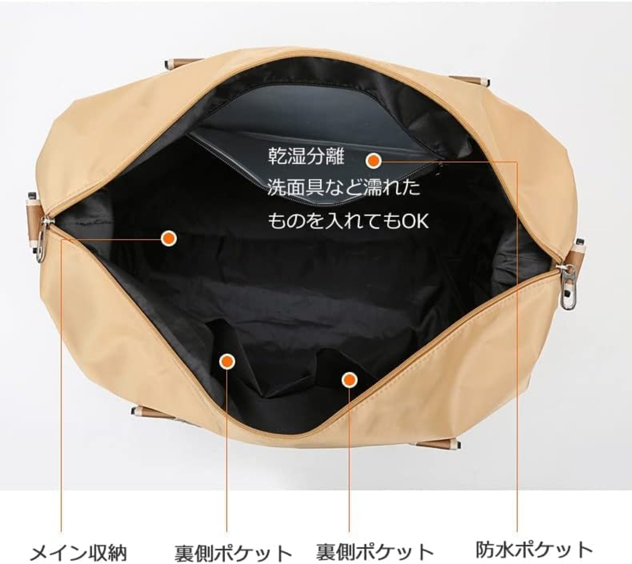 【大容量・たっぷり収納】35Lの大容量で仕上がり、メインポケット、小物ポケット、乾湿分離ポケット、フロント ポケット、裏側ファスナーポケットなどが設けられ、化粧品、衣類、電子デバイス、傘など2泊3日程度の荷物を 仕切りよく納められ、利便性が高いです