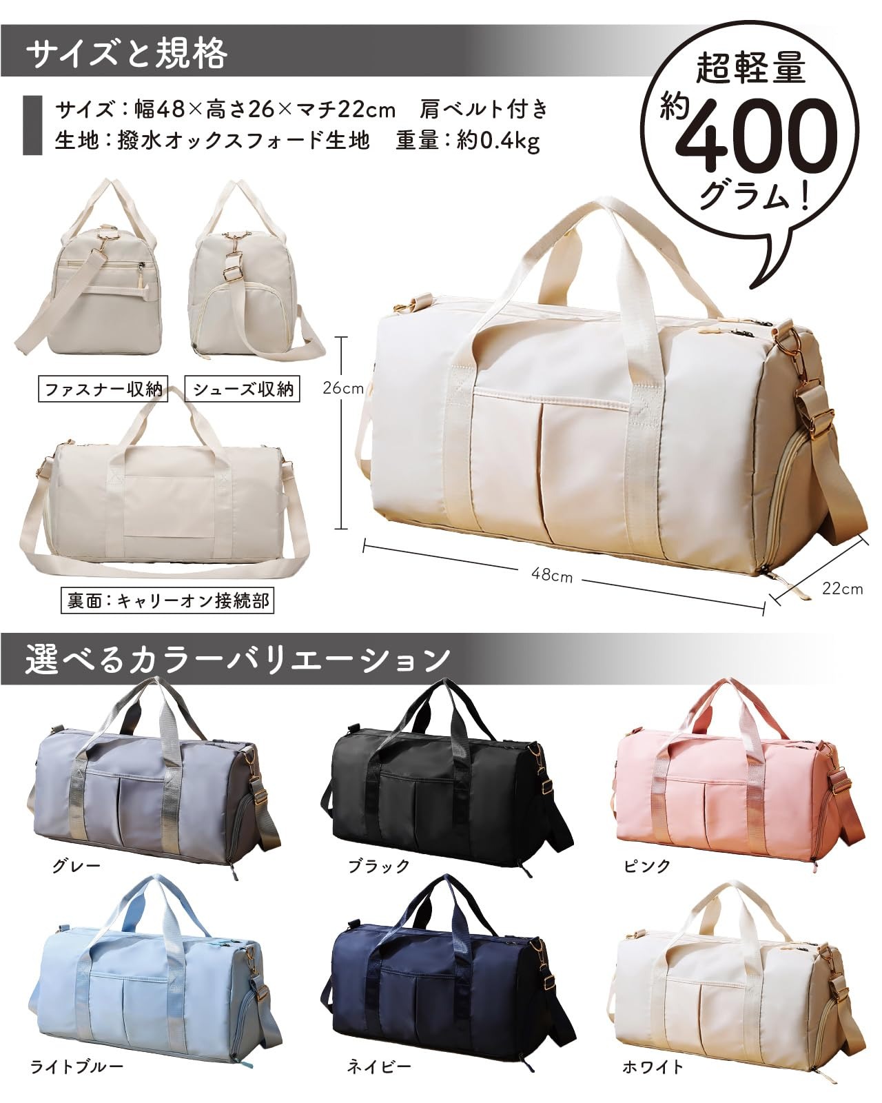◆3WAYで便利な万能バッグ/このボストンバッグは、手提げ、ショルダー、キャリーオンの3WAYで使用できる万能なアイテムです。シンプルかつおしゃれなデザインで、カジュアルからフォーマルなシーンまで幅広く対応し、男女問わずお使いいただけるのが特徴です。1泊から2泊程度の旅行バッグとしても最適で、機内持ち込み可能なサイズ感なので、サブバッグとしてもおすすめです。特に、シューズ収納ポケットや防水ポケットなどの多機能ポケットが充実しており、ジムバッグとしても大活躍します。軽量設計で持ち運びも楽々。ナイロン素材で作られたこのバッグは、旅行やスポーツ、日常のお出かけなど、あらゆるシーンで使いやすく、ライフスタイルをサポートします。豊富なカラーバリエーションから、自分にぴったりの色を選ぶことができ、ブラック、ホワイト、グレー、ピンク、ライトブルー、ネイビーといったカラーバリエーションも豊富です。
