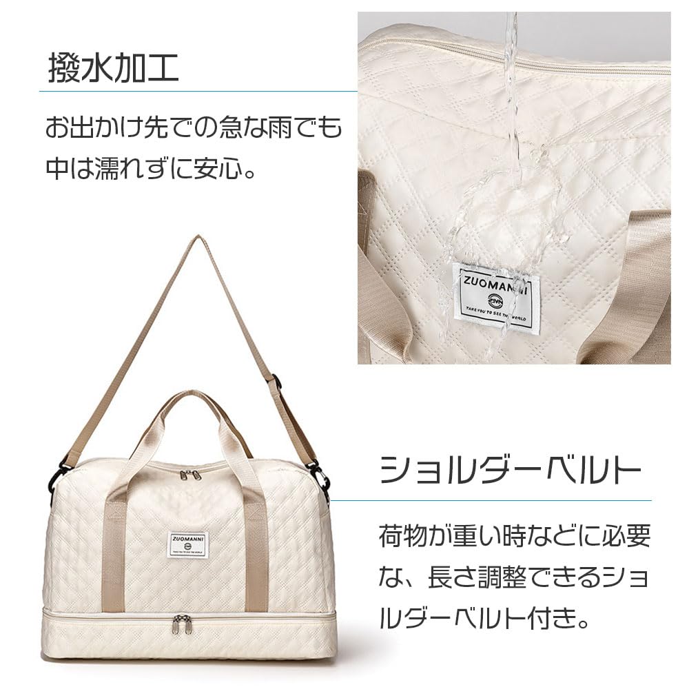 【撥水加工の大容量トートバッグ】納得の大容量!大きめサイズのボストンバッグです。旅行にはもちろん、荷物が多くなりがちなジムやゴルフ、アウトドアやマザーズバッグとしても重宝します。キャリーケースのハンドルに通せるので、キャリーオンバッグとしてもOK。落ちる心配もなく、移動の際の負担を減らせるので旅行用サブバッグとしては最適です。また、ジムやゴルフ用シューズなどを分けて収納できる分離型収納スペースがバッグの底にあり、汚れたものなどを同じスペースに収納したくない方には嬉しい機能付き。メイン収納の内ポケットは防水仕様になっており、濡れたバスセットなどをそのまま気兼ねなくしまえるようになっています。