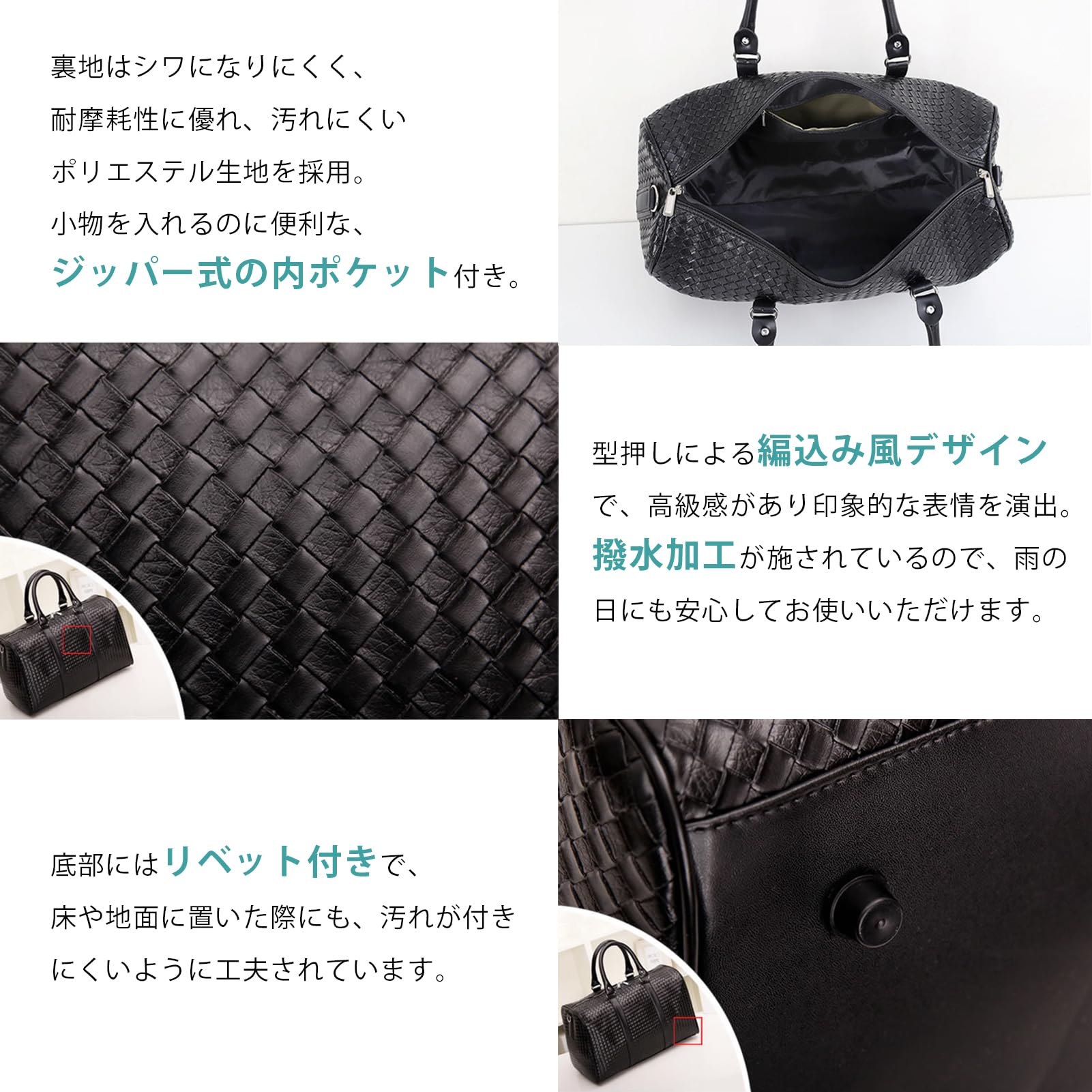 【商品概要】PUレザー編み込みボストンバッグ。編み込みデザインでシンプルながら上品で高級感のある仕上がり。男性、女性ともにご使用いただけます。