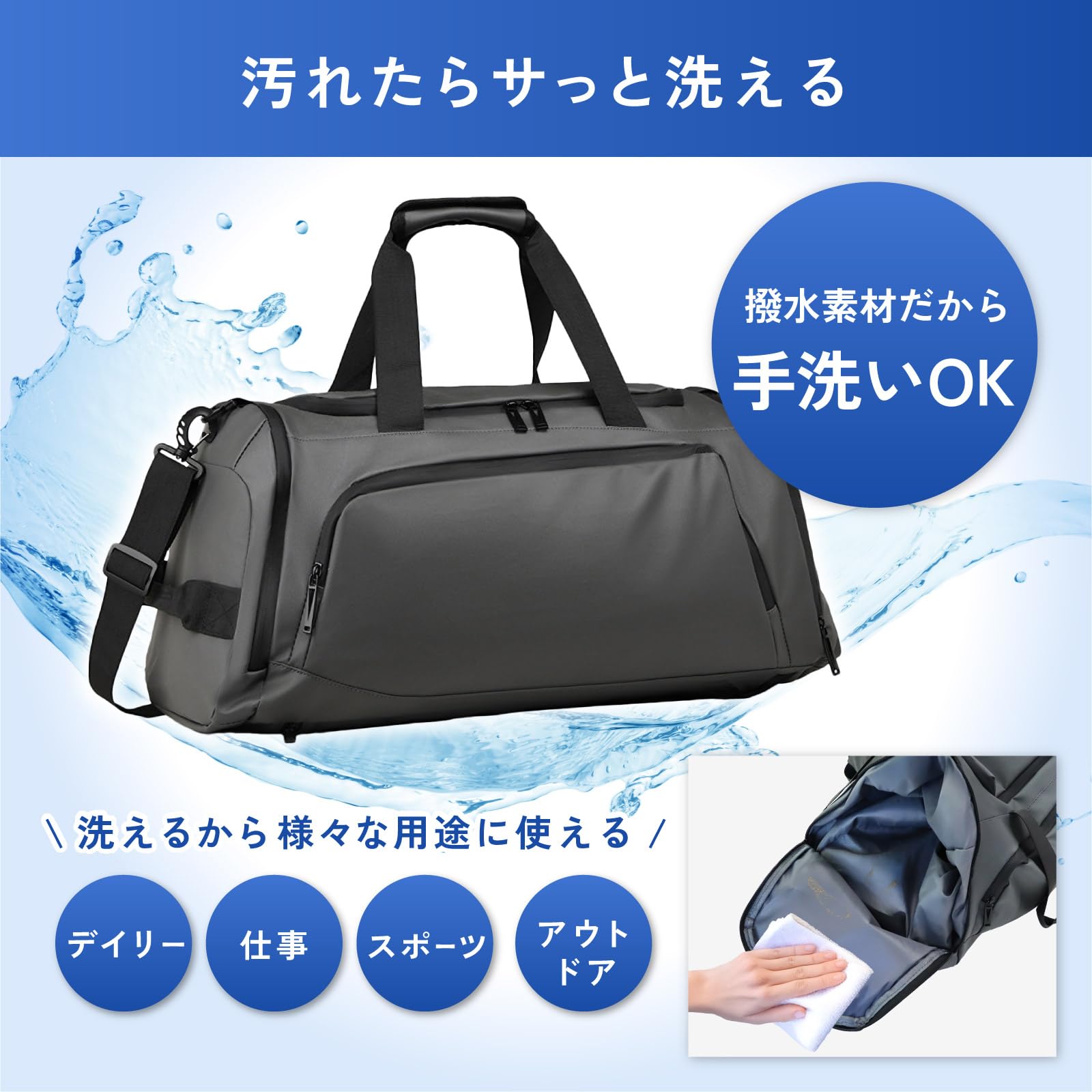 【撥水・防水性に優れた設計】ボストンバックの表生地は全面PVC素材を採用し、突然の雨でも中に浸透させない撥水性!外部ジッパーには、止水ジッパーを全面に採用し水の侵入を防ぎ、バッグの荷物を守ります。