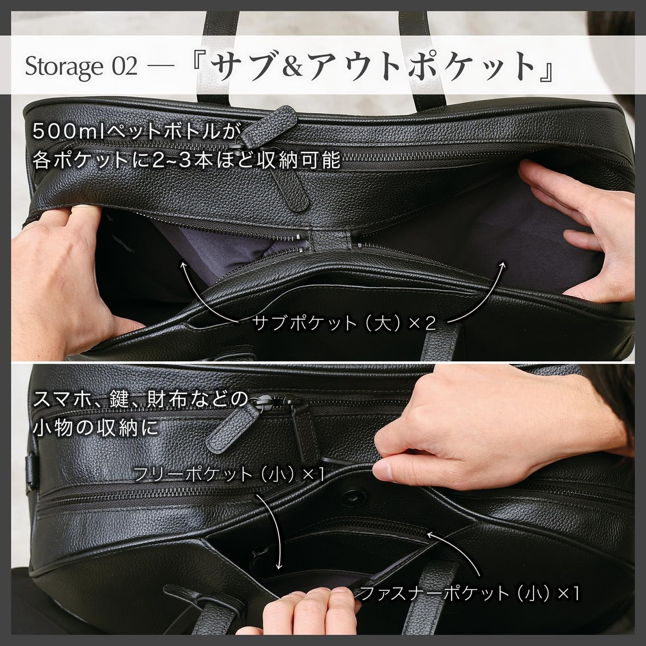 【誰でも整理上手になれる7ポケット】 スマホ専用ポケットは外側に配置し、サッと取り出すことがあるイヤホンやバッテリー、キーケースや鍵などの小物は外側ファスナーポケットへ。メインスペースは、Tシャツやシャツ、パンツなどの大物をパッと収納ができる大開口仕様で時間がないシーンでもストレスゼロ。サブスペースは、両側で4本〜6本のペットボトルを収納できるので、インナーやソックス、ベルトなどの小物を入れておけばサッと取り出すことが可能です。本革ボストンバックを探している方は、ぜひ一度手に取っていただきたい定番モデルとなっています。