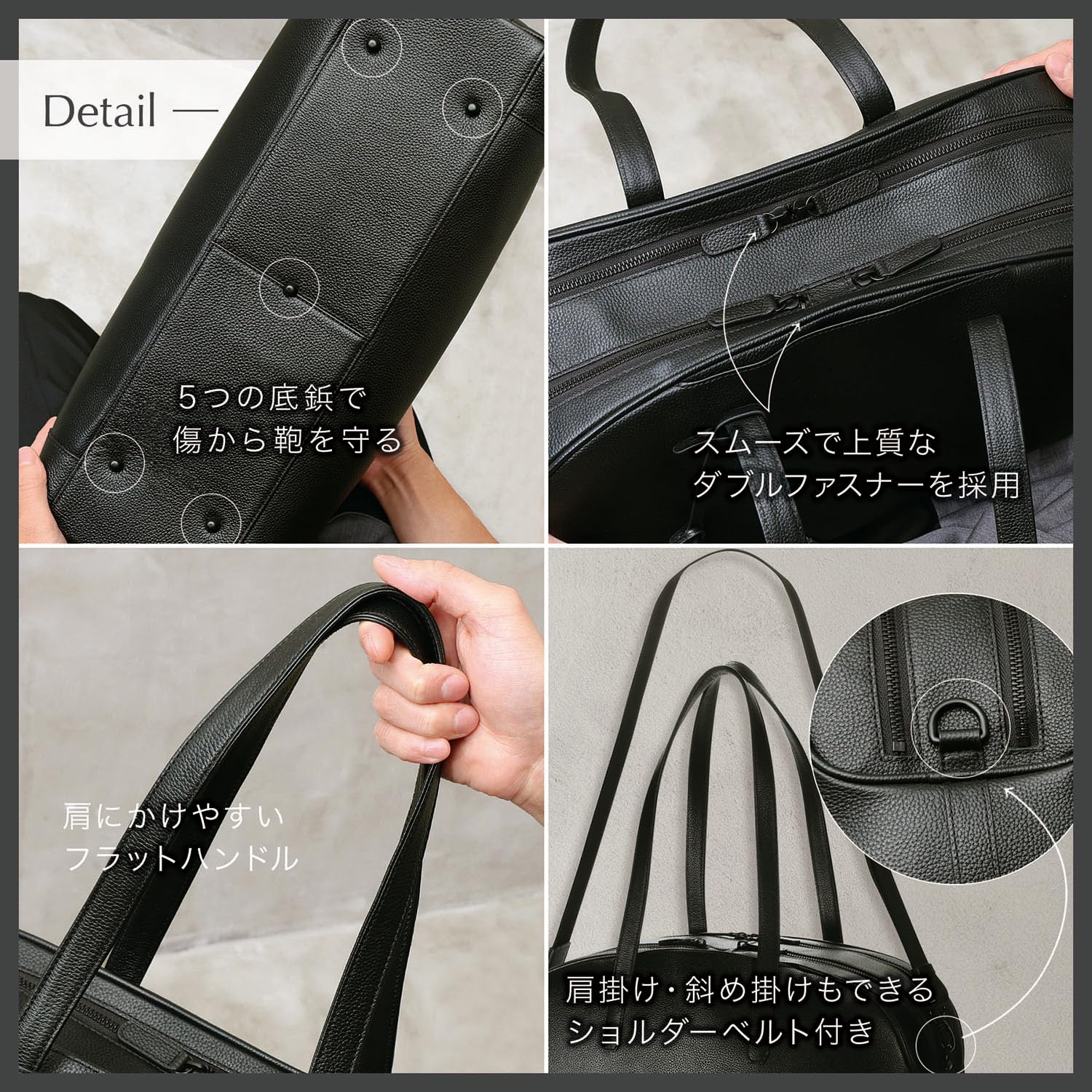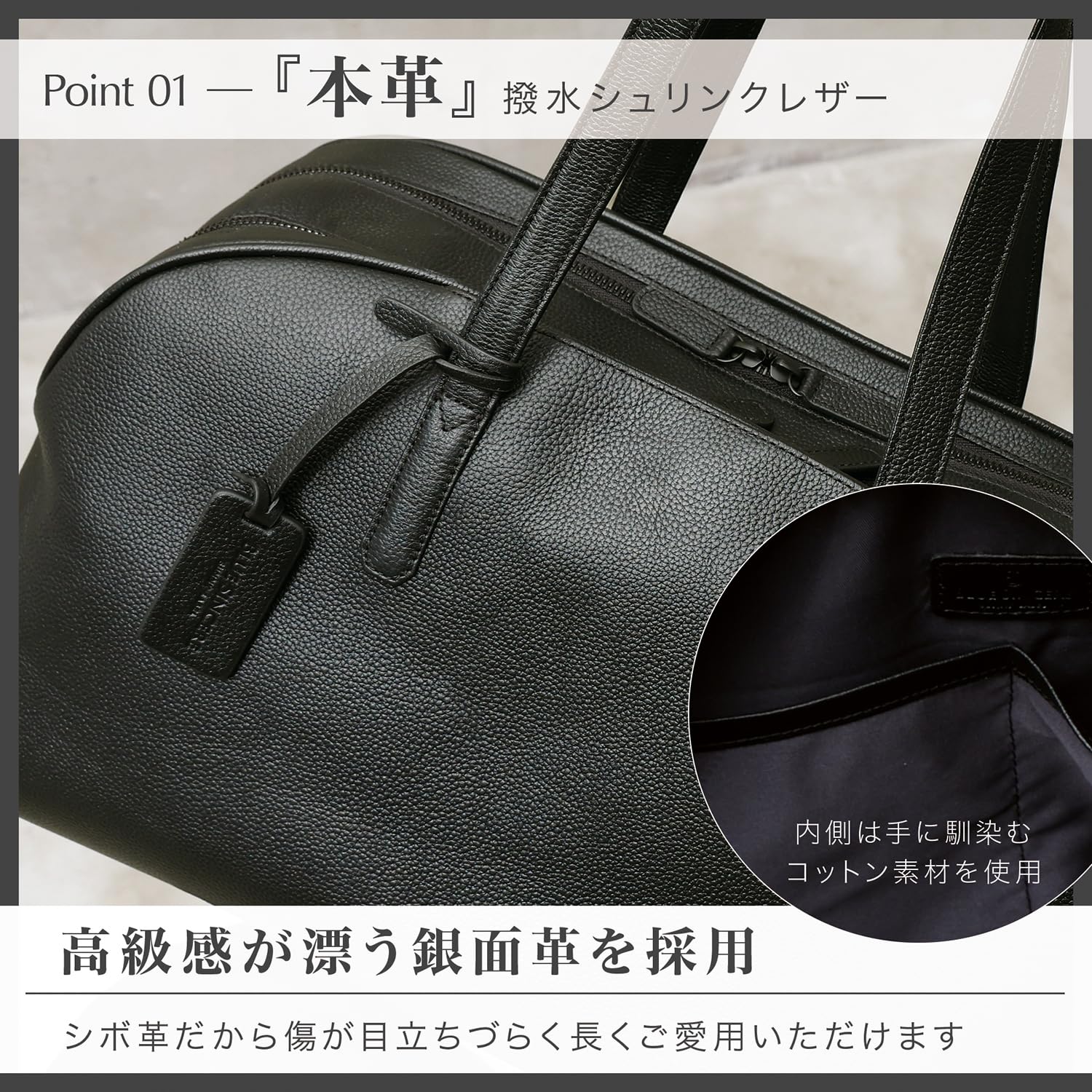 【選び抜いた環境想いの本革素材】 「ずっと長く愛用してほしい。」その想いから素材選びに徹底的にこだわりました。 素材には耐久性に優れた植物タンニン鞣しベースにクロム鞣しの混合鞣しのシボ革を採用しました。すぐに傷が付いてしまう羊革や合革では使う度のお手入れが大変ですが、シボ革は傷が付きにくく、目立ちにくいので毎日ガシガシお使い頂くことができます。 忙しいあなたでも日々の大変なお手入れの必要がありません。 また、シボ革は耐久性に優れているのでずっと長くご愛用頂くことで、味が深まって行きあなただけのボストンバッグに育てていくことができます。