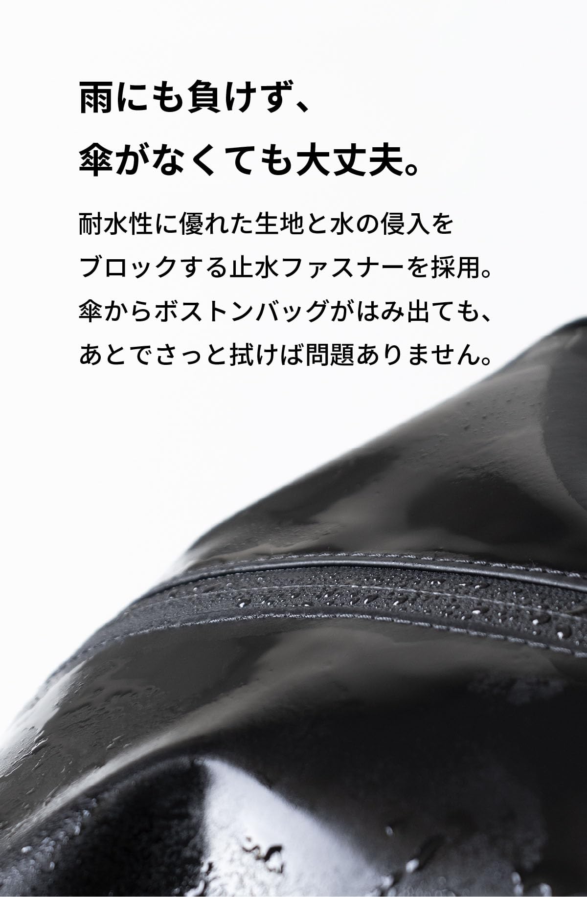 雨にも負けず、傘がなくても大丈夫。耐水性に優れた生地と水の侵入をブロックする止水ファスナーを採用。傘からボストンバッグがはみ出ても、あとでさっと拭けば問題ありません。
