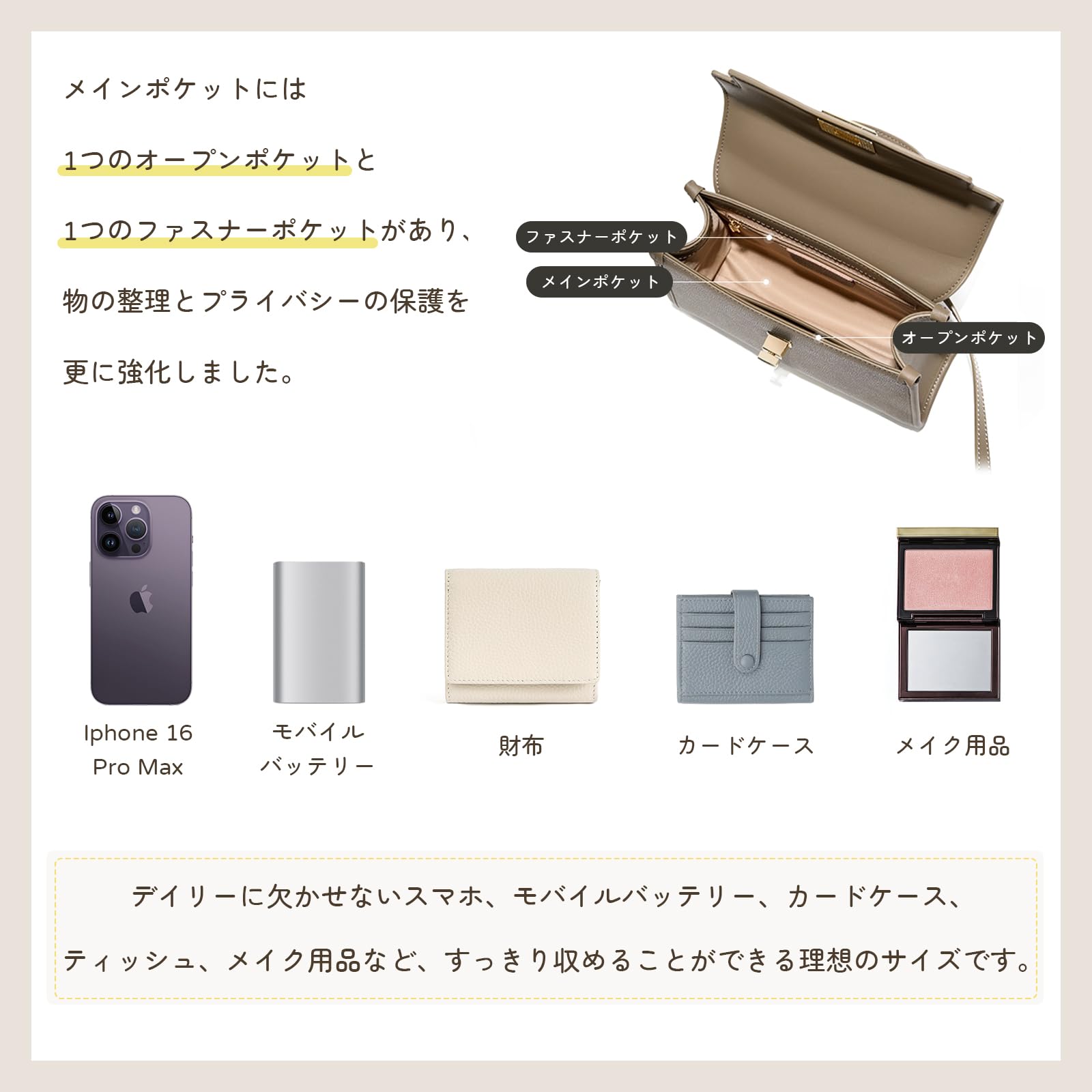 『飽きこないデザイン』シンプルながら上品なデザインで、年齢やシチュエーションを選ばず使えます。日常生活、通勤、旅行など、多岐にわたるシーンで活躍しています。使い勝手も良いコンパクトな大人エレガントなショルダーバッグです。