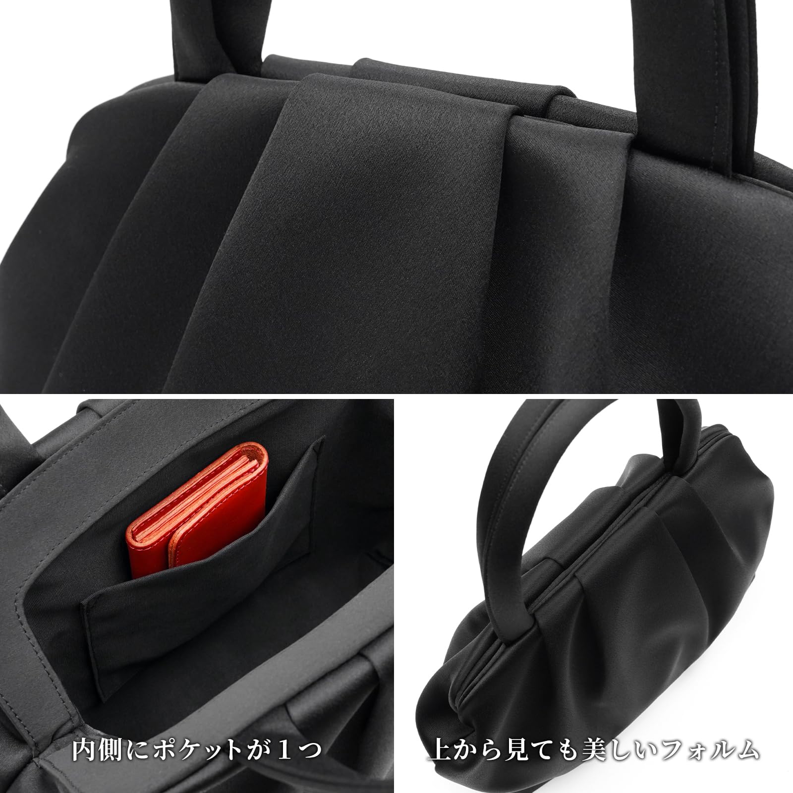 本体の生地は上品な微光沢感のある素材を使用し、装飾は至って控え目に。正面も背面も同じプリーツのデザインになっています。ハンドルには芯が入っているので、形をしっかりキープできます。