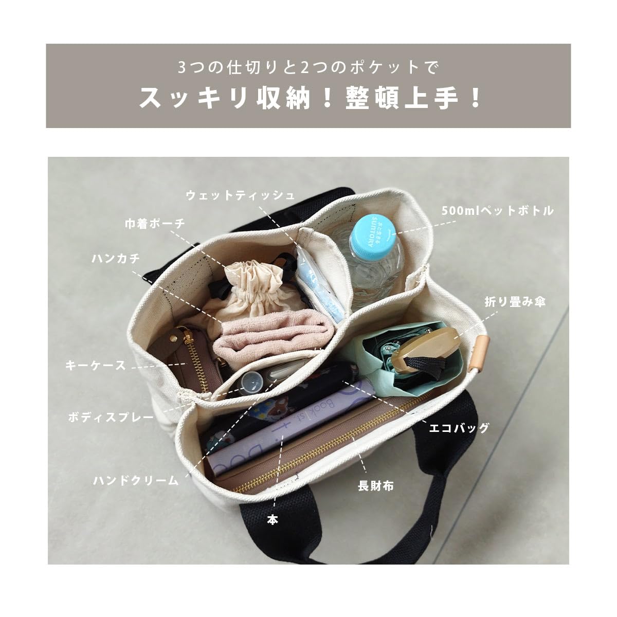 3つの仕切りと2つのポケットでスッキリ収納できるミニトートバッグ。 仕切りがあるので荷物を綺麗に整理整頓して入れられます。 ペットボトルを入れるのに便利な縦型収納。 携帯を入れるのに便利なオープンポケット。 大きめのポーチやランチボックスも入るメイン収納部分など 見た目以上の収納力と機能性。 底板が取り外し可能なので、汚れが溜まっても 掃除が簡単にできます。 通勤、通学やお出かけなどに使いやすいサイズ感なので、 年齢問わず使えるバッグです。