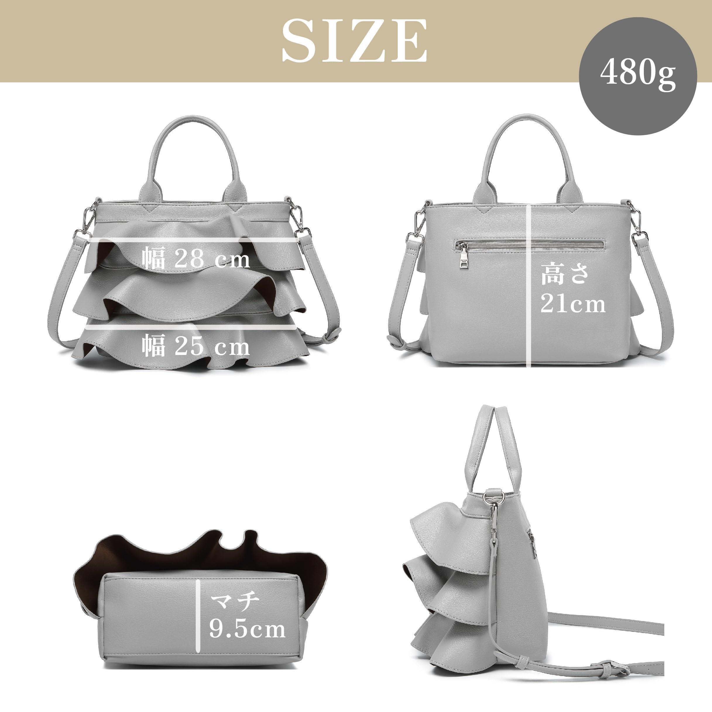 お客様の声を受けて、フリルがつぶれないよう梱包方法改善いたしました。 【サイズ】幅:上部 約28cm 下部 約25cm、 高さ(中央部):約21cm、 マチ:約9.5cm、 ハンドル:長さ 30cm 高さ 11.5cm ショルダー:約107~122cm 重量:480g 【開閉部】ファスナー、 両あおりポケット(開閉部マグネット)【 内側ポケット】ファスナーポケット×1、オープンポケット×2 【外側ポケット】背面ファスナーポケット 【素材】PUレザー