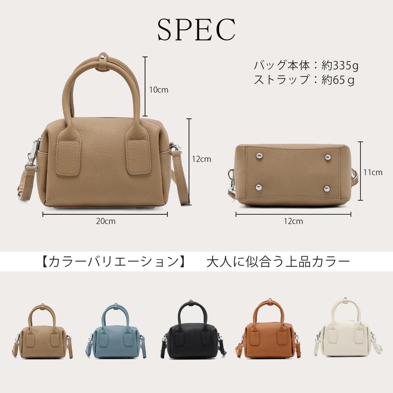 『軽量約400g|毎日の持ち歩きにも快適』 バッグ本体は約335g、ショルダーストラップを合わせても約400gと超軽量。長時間の外出や旅行先でも負担にならず、気軽に持ち歩けます。ミニバッグにありがちな“重さのストレス”とは無縁です。