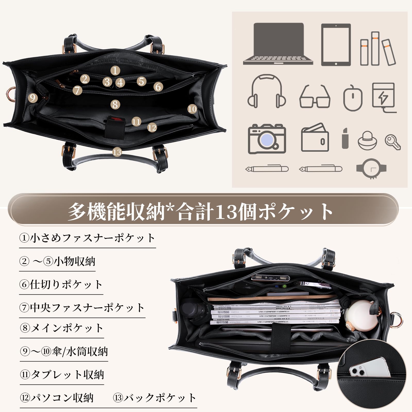 実用なポケット:ファッション性を兼備するだけでなく、実用性もあるビジネストートバッグです。メインポケットはA4サイズの書類や15.6インチのPCを収納できます。また、パソコンとタブレットの収納ポケットにはスポンジが入っており、衝撃を吸収する優れたクッション性があります。さらに、キーホルダーや小物整頓用の仕切りポケットも付いており、水筒や傘などを収納できるメッシュポケットもあります。外出先で必要なものをすべて収納できるため、非常に便利なビジネストートバッグです