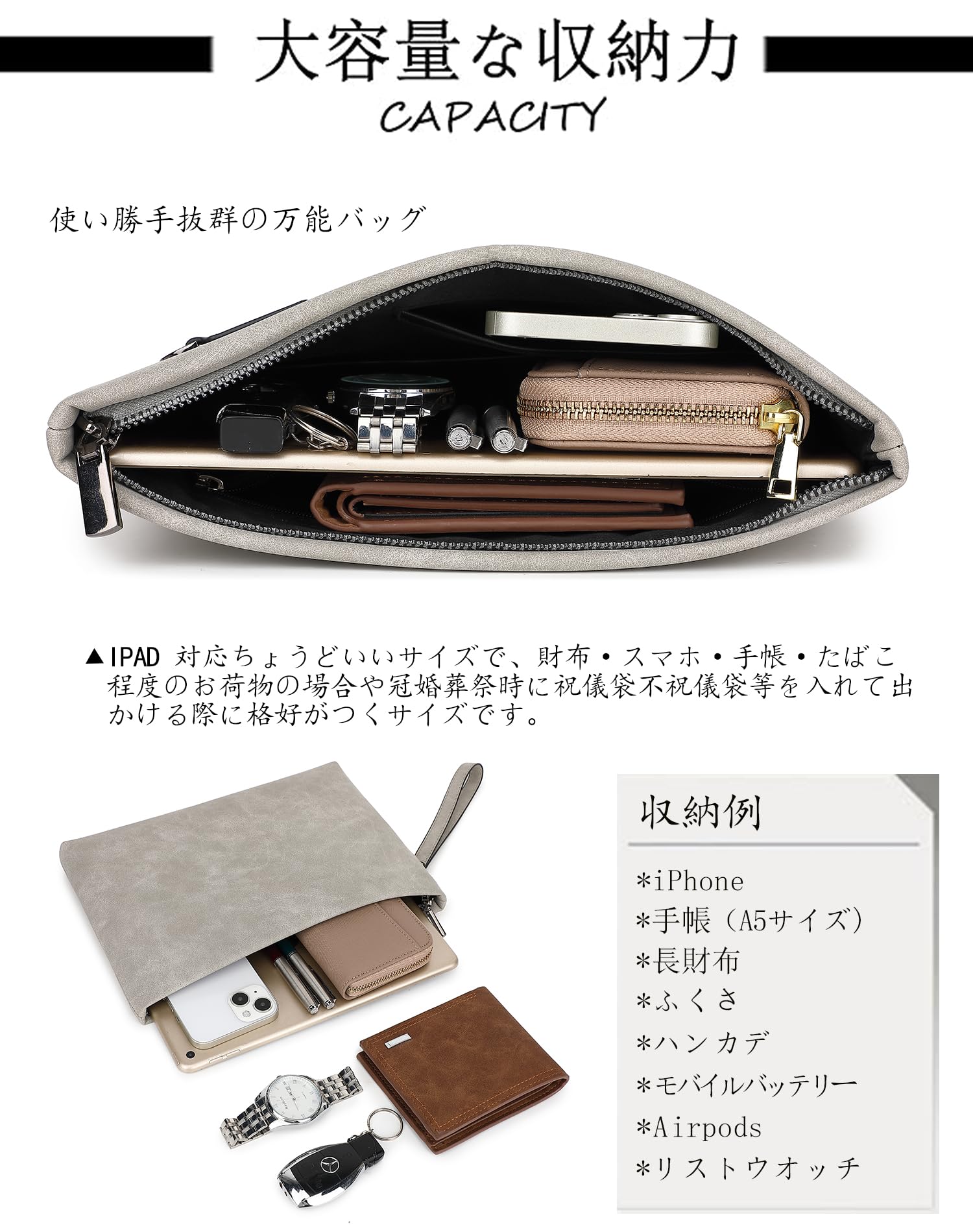 【サイズ仕様】横28cm×縦19cm×マチ3cm、重さ:250g。長財布、服紗、タブレット(9.7インチまで)、文庫本など入る便利なサイズ感です。冠婚葬祭、パーティ、レジャー、バッグインバッグ、貴重品入れのポーチなどに使いやすいサイズ感です。付属:取り外せるストラップ付き