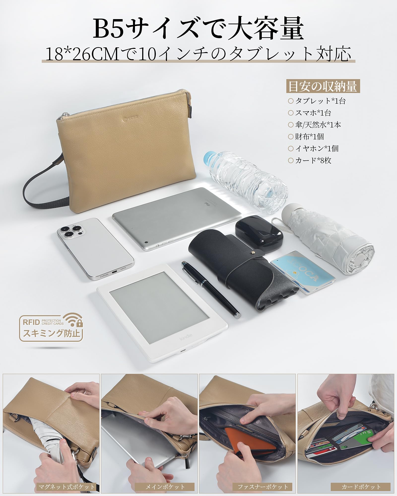 [Modiko] サコッシュ ショルダーバッグ メンズ クラッチバッグ 本革 柔らかい 防水 大容量 B5 薄型 フルグレインレザー スキミング防止 2wayストラプ付き カード8枚収納 10インチタブレット対応 紳士鞄 結婚式