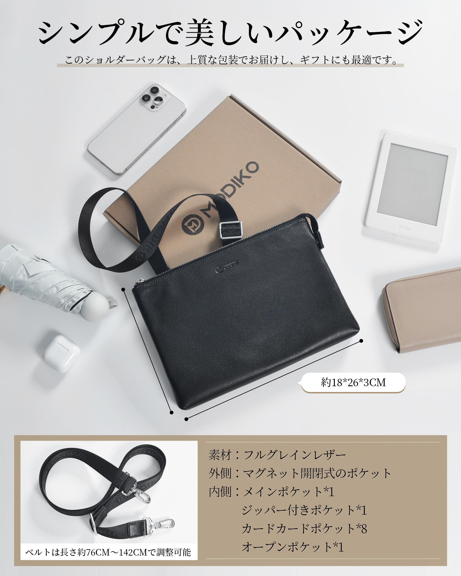 [Modiko] サコッシュ ショルダーバッグ メンズ クラッチバッグ 本革 柔らかい 防水 大容量 B5 薄型 フルグレインレザー スキミング防止 2wayストラプ付き カード8枚収納 10インチタブレット対応 紳士鞄 結婚式