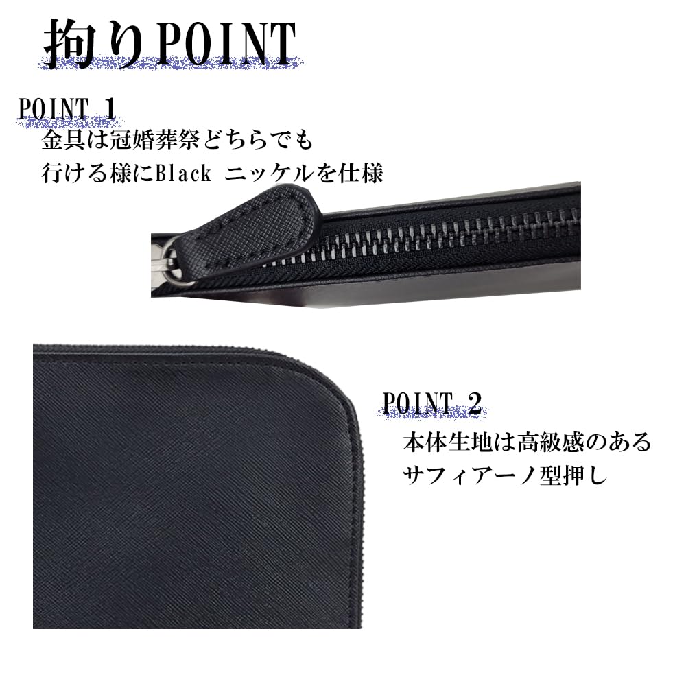 開閉はファスナータイプ。冠婚葬祭どちらでも使用出来るようブラックニッケルカラーを採用。本体幅は約30cm袱紗等の出し入れもスムーズです。