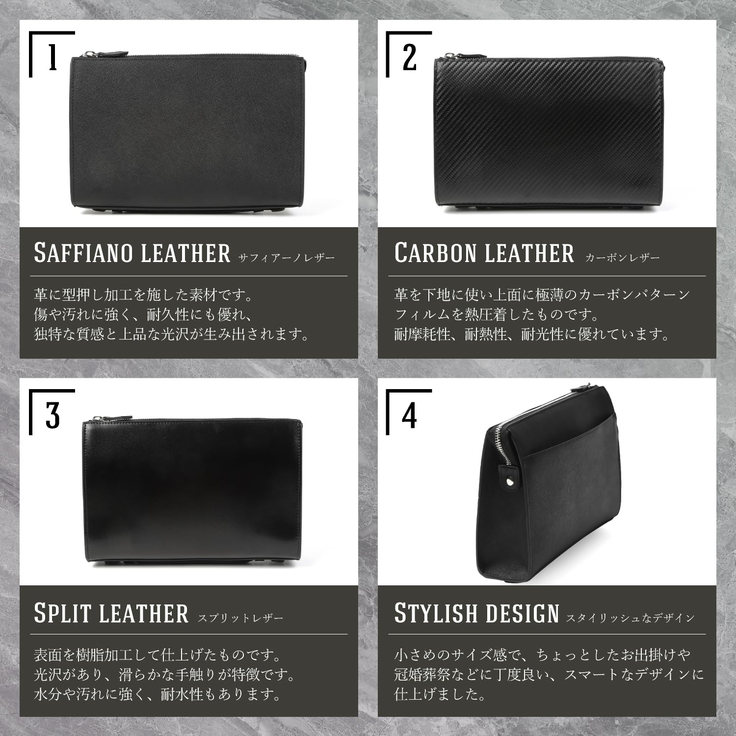 【 デザイン性と機能性 】 ●デザイン性:使い勝手のいい絶妙なサイズ感と、シンプルでスマートなデザインに仕上げています。 ●機能性:大きく開くファスナーと7cm程のマチがある為、荷物の出し入れがスムーズで、コンパクトながら収納力もあります。また外側内側共にポケットが付いていますので、小物類の収納にも便利です。 ●高級感漂う3タイプのブラックで、サイズ、デザイン、素材、機能性と、どんな場面でもマルチに使える、こだわり抜いた逸品です。