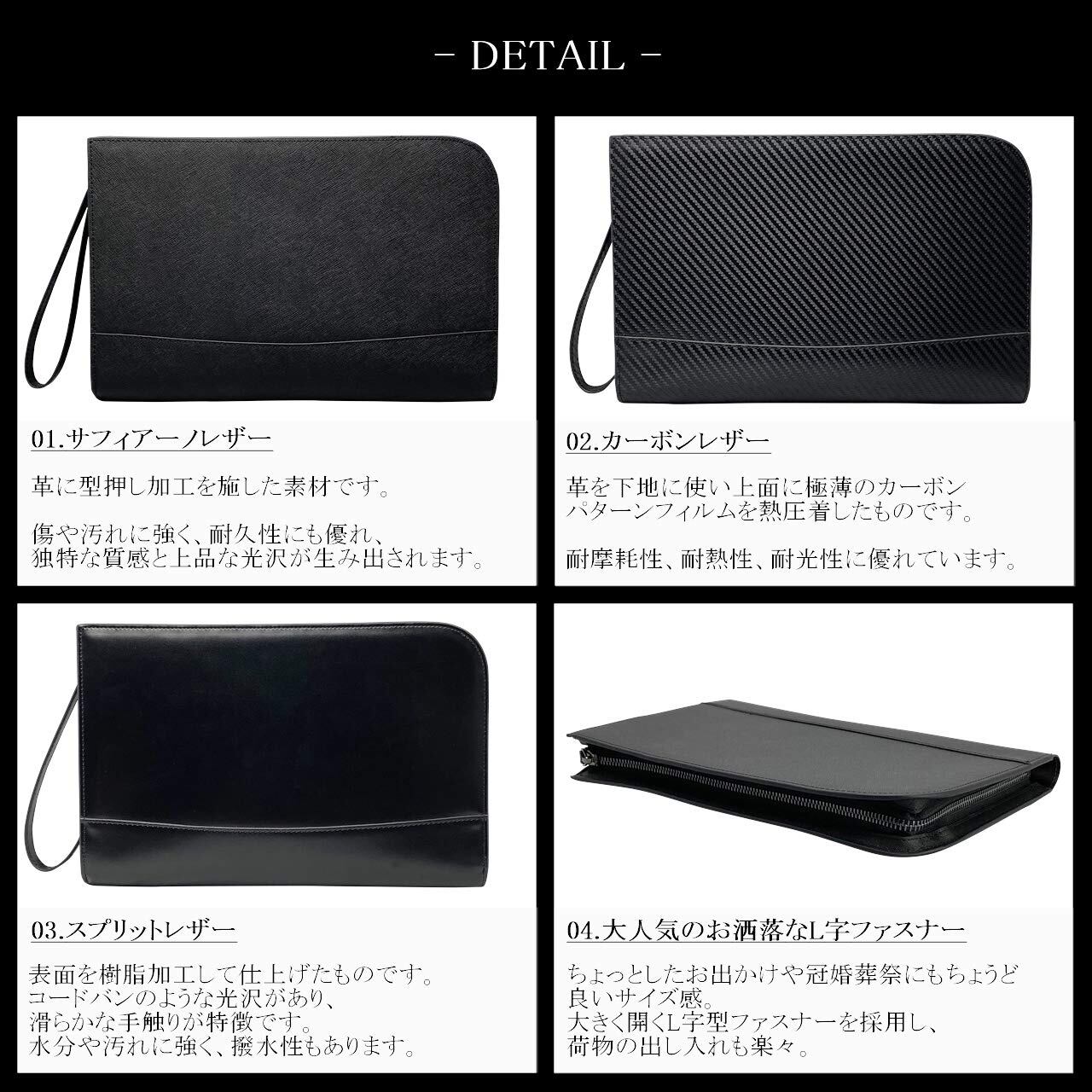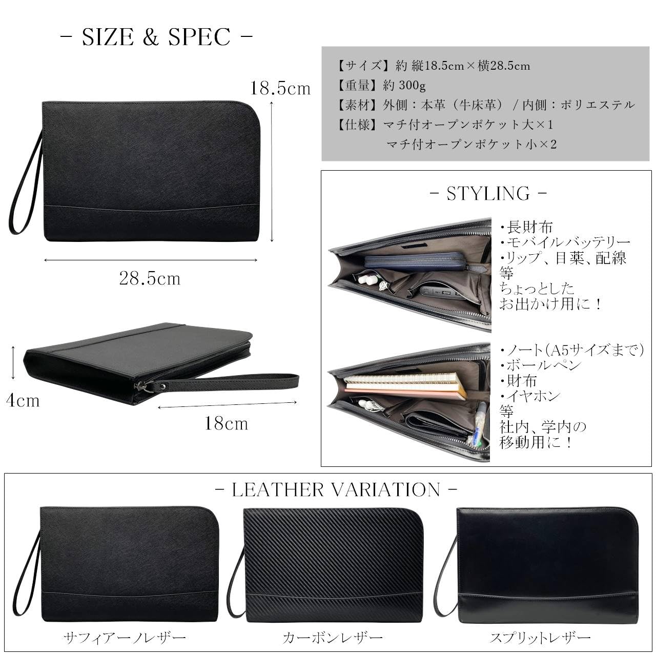 【 素材 】外側 / 本革(牛床革) 内側 / ポリエステル 【 サイズ 】約 縦18.5cm×横28.5cm 【 重量 】約300g 【 仕様 】マチ付オープンポケット:大×1 / マチ付オープンポケット:小×2 【 生地 】 サフィアーノレザー / カーボンレザー / スプリットレザー 【 カラー 】 ブラック