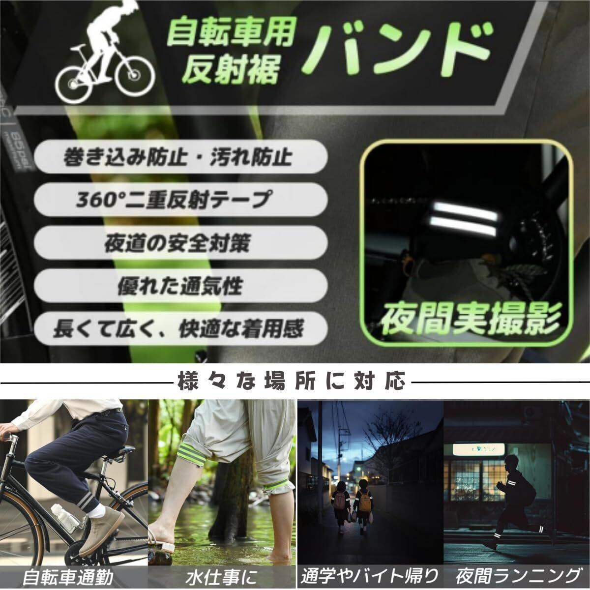 【大人気裾止め反射バンド】マジックテープが付いているのでワンタッチで脱着可能です。反射バンドとして夜間走行時の事故予防できます。暗闇を歩く人はドライバーにとって見えづらいため、自転車通学・通勤の方やお子様の夜間塾通いなどには特に注意が必要です。夜間や夕暮れ時に、視界の悪い道路や人通りの少ない夜道でも自分の存在をアピールできます。裾の擦れ対策としてズボンの裾をしっかり留めることができ、足首からズレたり、はだけたりすることを防ぎます。自転車走行ではチェーンやペダルに引っかかることがなくなり、安全性が向上します。