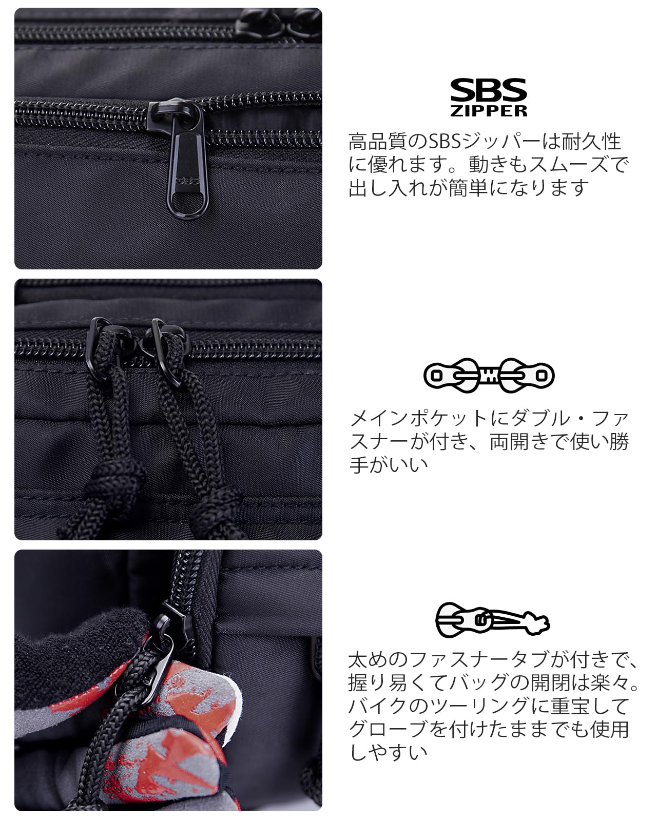 実用的ファスナー: 高品質のSBSジッパーは素晴らしい耐久性を持ち、滑りが良くて出し入れが簡単になります。太めのファスナータブが付きで、握り易くてバッグの開閉は楽々、グローブを付けたままでも使用しやすいです。さらに、メインポケットにダブル・ファスナーが付き、両開き可能でで使い勝手がいいです