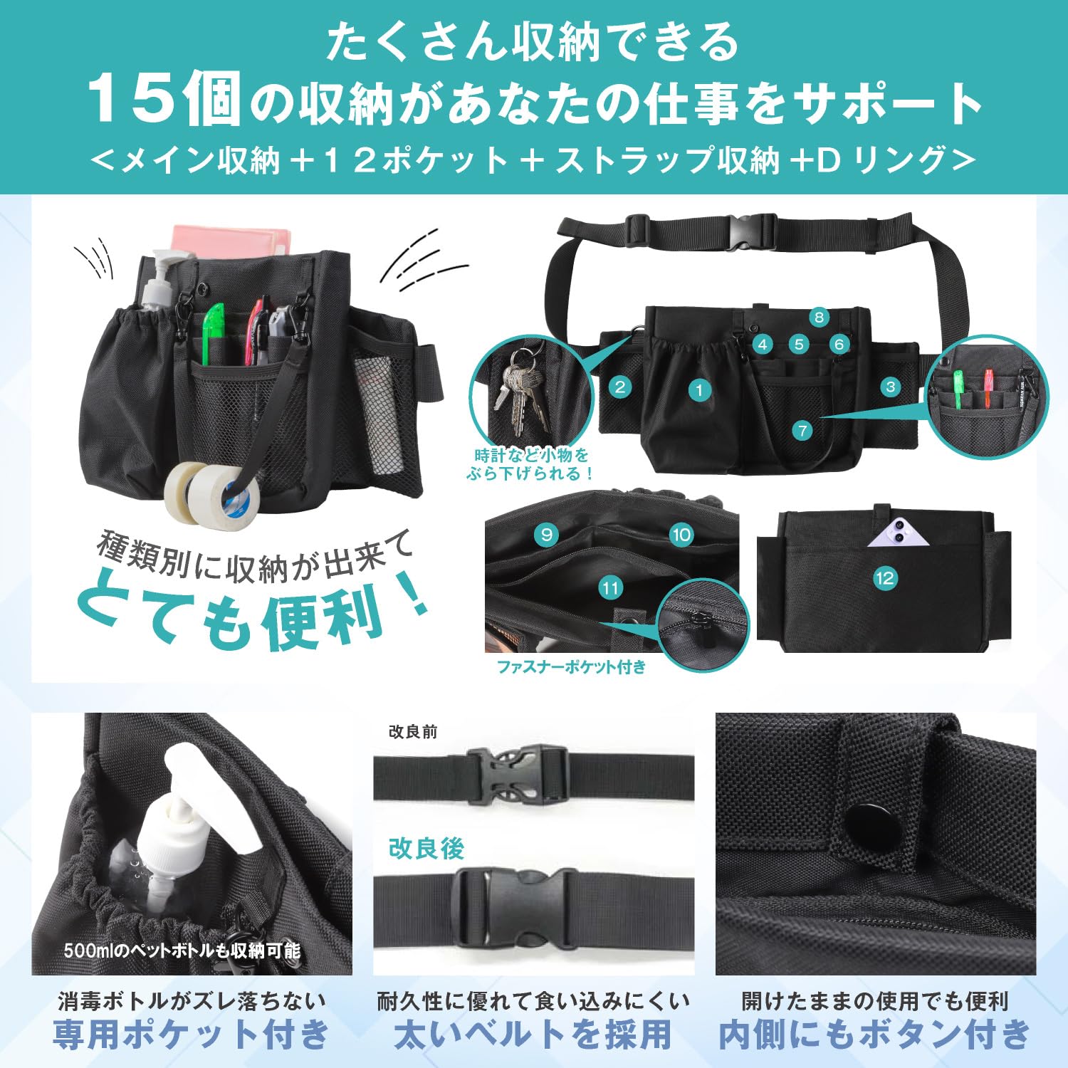 GEELO ナースポーチ ウエストポーチ 【医療現場で誕生、医師・看護師監修】 5cmのマチ付き 15個の収納 消毒ボトルポケット ファスナー付き内ポケット テープホルダー メンズ レディース