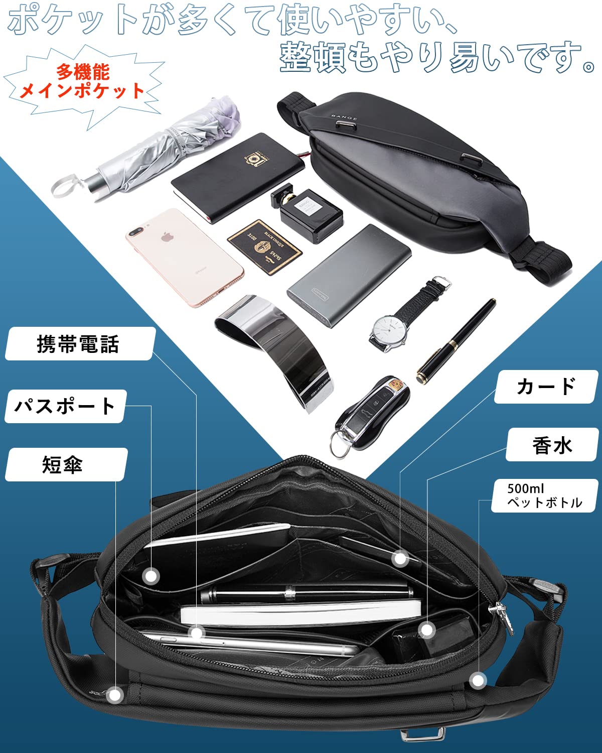 このサイズでも大容量の収納力:サイズ:縦28cm×横14cm×マチ7cm、重量:约0.35kg。7つの収納ポケットで想像以上に入る、財布、スマホ、ペットボトル500ml、タバコ、キー、定期入れを整理しながら入れられる充実した収納力です。