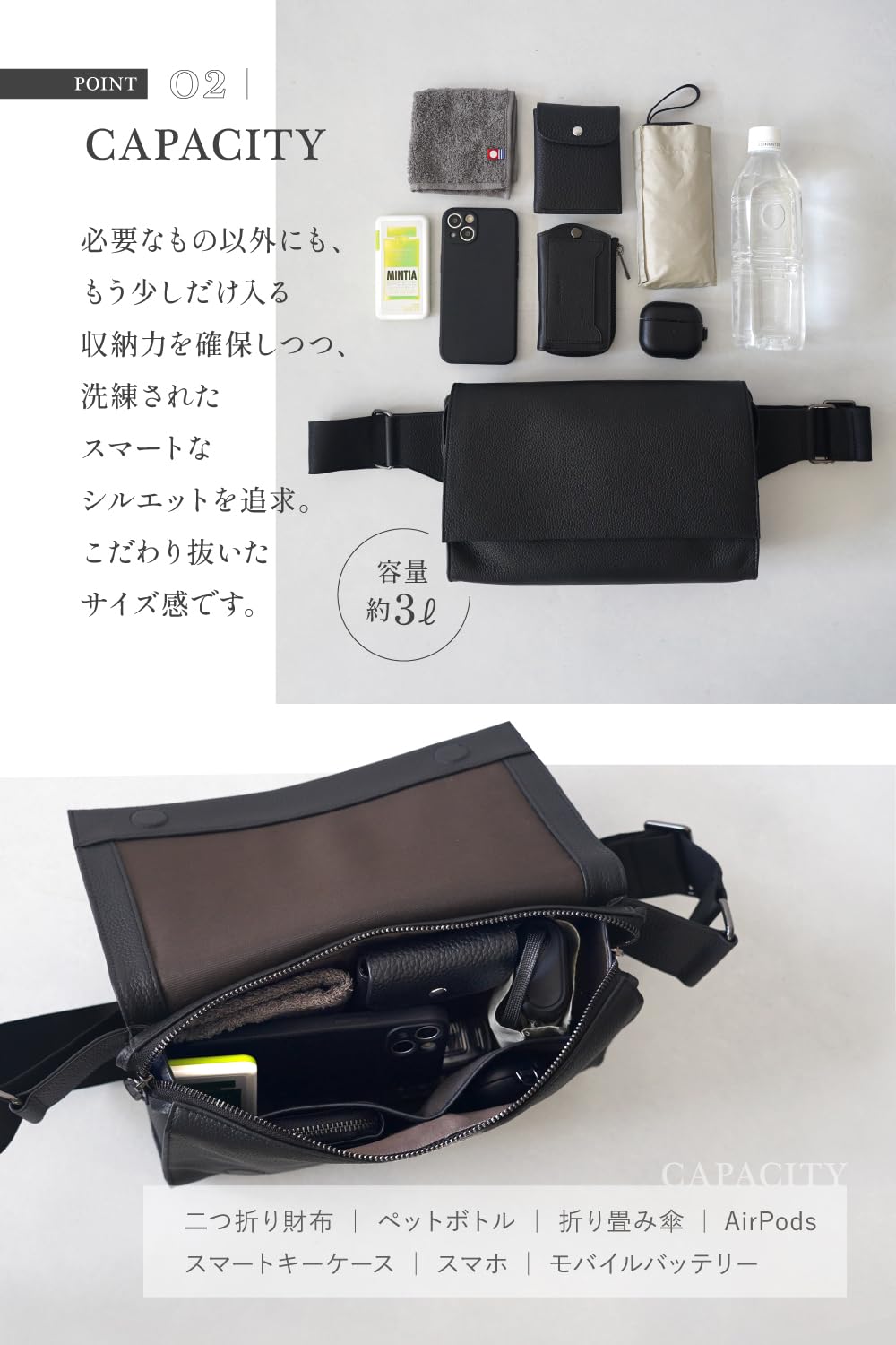 【ちょうどいい収納力】\見た目以上に頼れる約3リットル収納/ 財布や500mlペットボトル、スマホ、小物類などがしっかり収まります。 必要なもの以外にも、もう少しだけ入る収納力を確保しつつ、洗練されたスマートなシルエットを追求。こだわり抜いたサイズ感。(収納例)二つ折り財布・ペットボトル・折り畳み傘・キーケース・スマホ・エアポッズ・ハンカチなど
