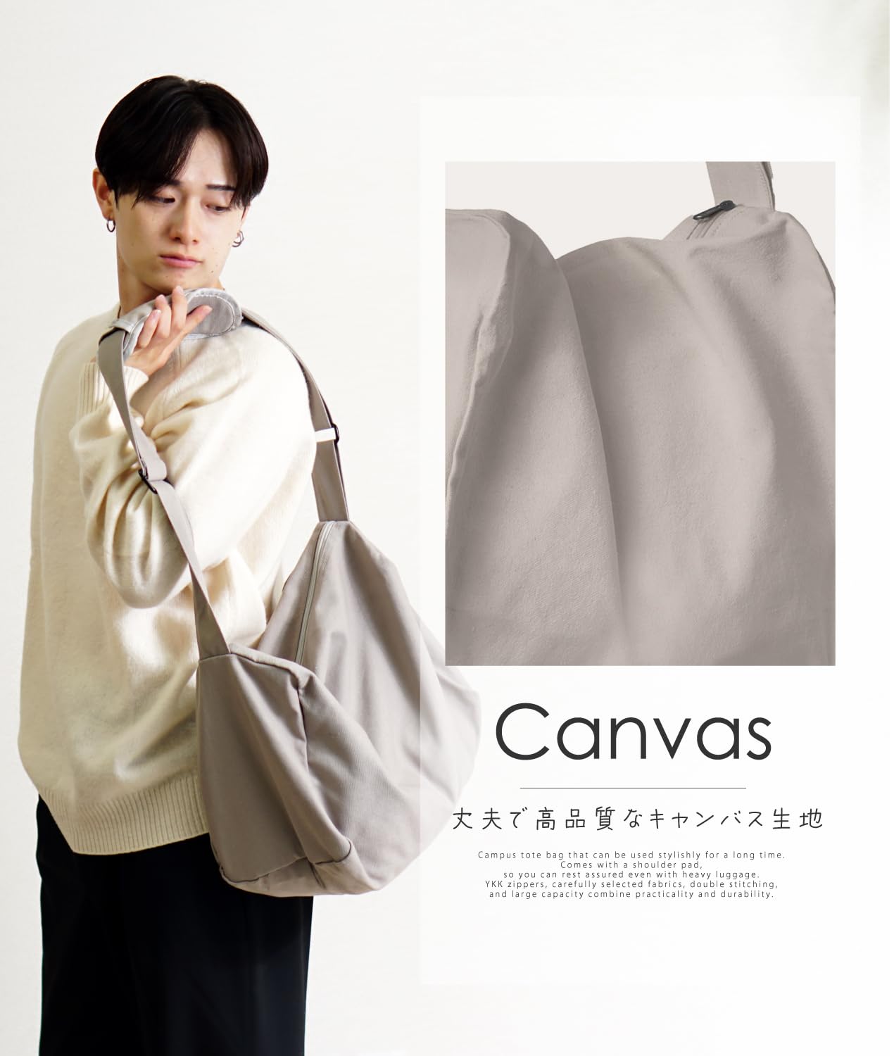キャンバス 【徹底的にこだわった品質 】荷物が多くなりバッグが重くなっても安心「脱着可能ショルダーパッド」を付属。すぐ取りたい物を分けて収納できる「大容量内ポケット」に加え、安心の高耐久「YKKファスナー」を採用。また、強度面では安心の高強度「鉄製バックル」とショルダー付け根部への「二重縫製」で高強度を確保。 使い方のシーンにおいては、 スクールバッグ メッセンジャーバッグ エコバッグ 旅行バッグ ショルダーバッグ 、本製品1つでマルチに活躍します。
