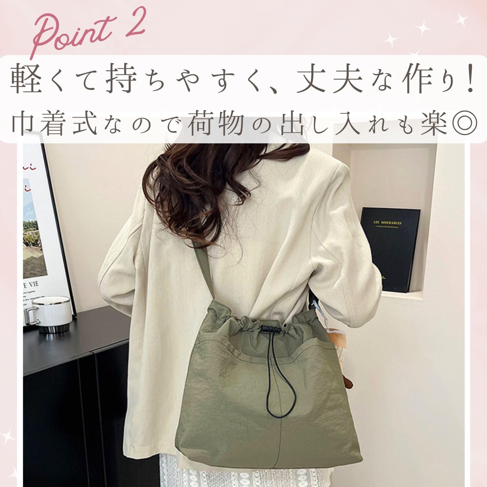 【巾着×ショルダーの優秀デザイン】開閉しやすい巾着タイプで、荷物の出し入れもスムーズ。 長さ調整可能なショルダーストラップ付きで、肩掛けも斜め掛けもOK。