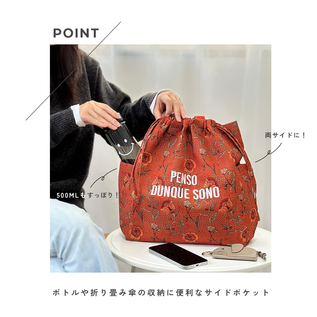 デザイン:総柄プリントデザインがエスニックでお洒落。ドローコードで巾着型に。A4、マチ広で大容量。二つのサイドポケット付きで折り畳み傘や500mlのペットボトルも収納可能◎