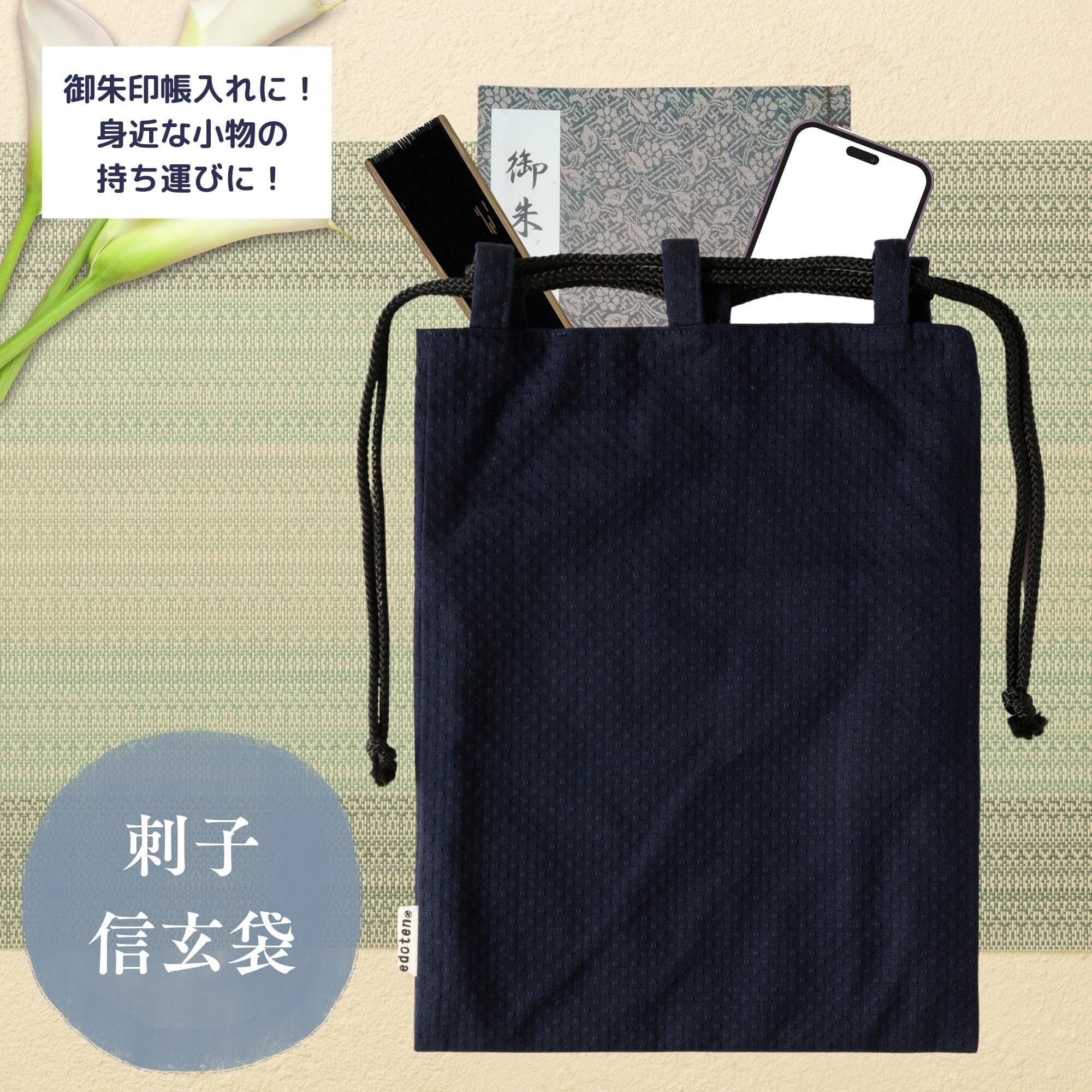 おしゃれで便利な[江戸てん] 信玄袋が登場!伝統的な抜染柄が施された刺子生地を使用したこの合切袋は、日常の小物入れとしてはもちろん、御朱印帳入れとしても大活躍します。幅広いシーンで使える、この信玄袋はあなたのスタイルに和のアクセントを加えます。