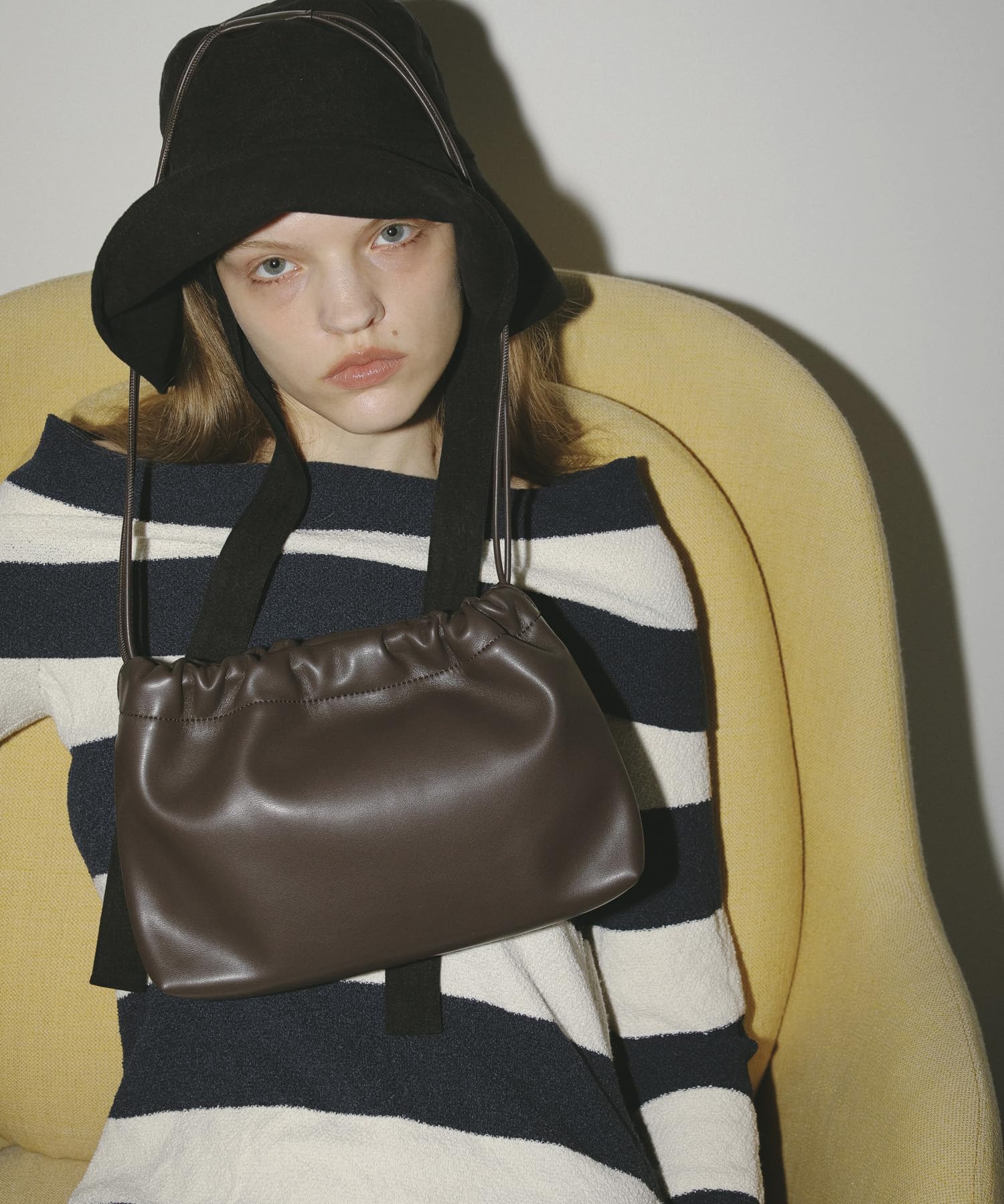 くたっと柔らかめの素材を使用。 短めのショルダー紐は肩掛けで使うのがおすすめ。 巾着デザインなのでくしゅっとした雰囲気で持てるカジュアルバッグです。