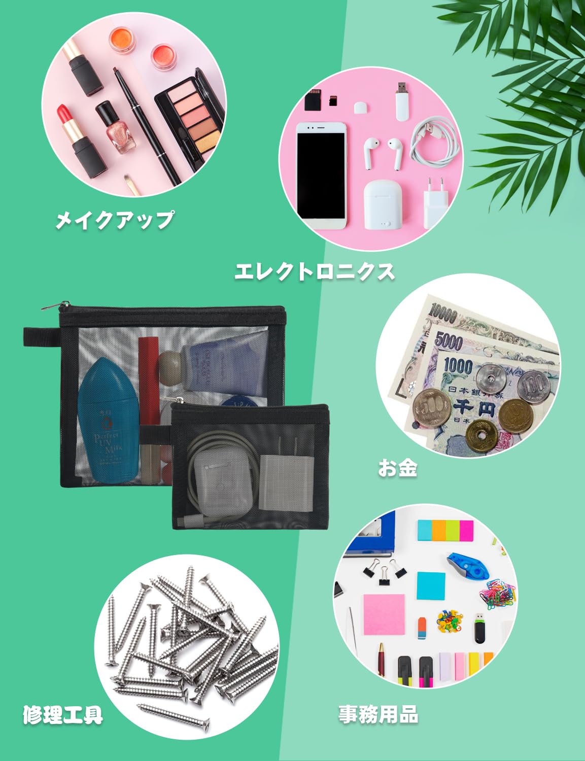 小物整理違いサイズのメッシュ化粧バッグを使用すると、いろいろな小物をさまざまなカテゴリに分類して整理できて、自宅やオフィスをきれいに保つことができます