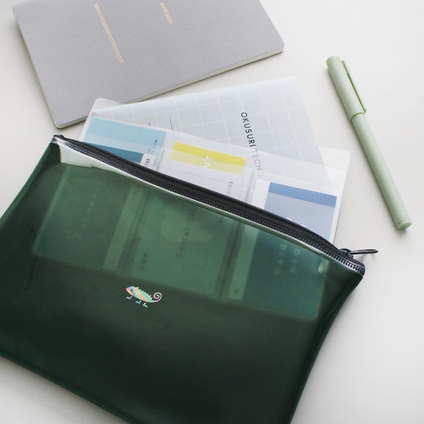 ノートと一緒にカードなども整理できる、B6サイズ対応のマルチポーチ。カード6枚と、お薬手帳や通帳が収納できるカードホルダーが付いていて、病院や銀行に行く際にも活躍します。前面は色付きの透明生地なので、プライバシーを保護しつつ中身が見やすい便利なポーチです。
