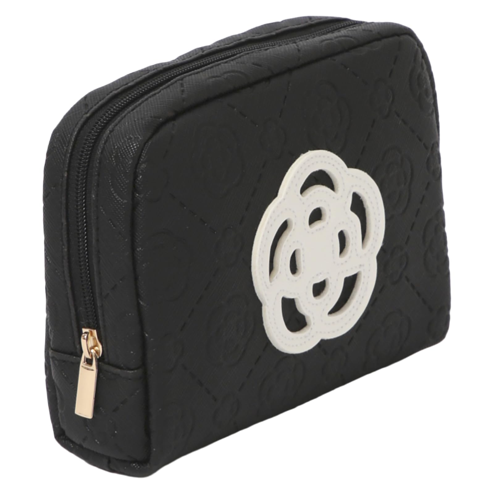 【CLATHAS(クレイサス)のレディース スクエアポーチ】コスメポーチにもガジェットケースなど様々な用途で使えるスクエア型のポーチ。クレイサスを象徴するカメリア柄を格子上のデザインに散りばめ型押しされたかわいらしいデザインが魅力。