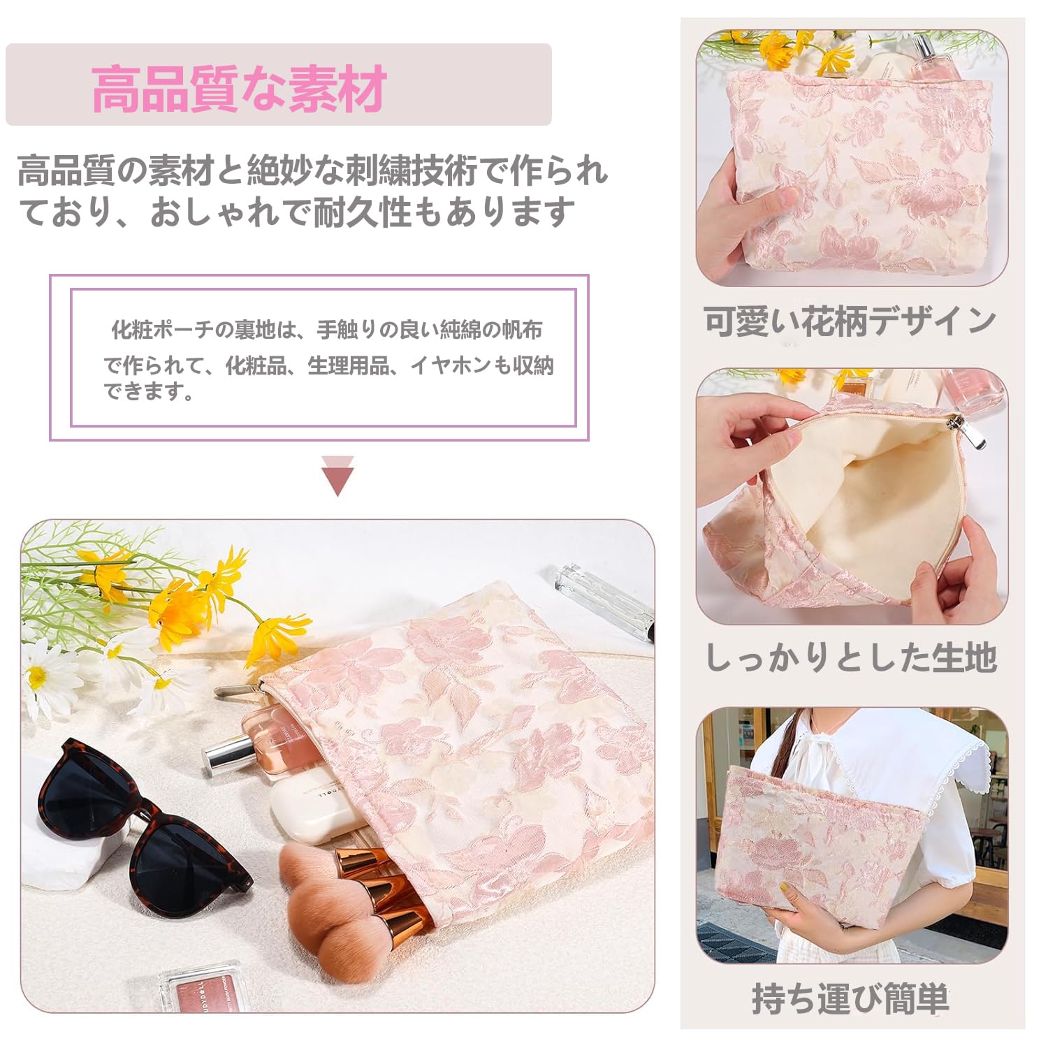 【可愛い花柄刺繍デザイン】 この化粧品ポーチ高級感のある綿生地に、職人が丁寧に施した花柄刺繍が特徴のおしゃれな化粧ポーチです。繊細な刺繍模様が女性らしい優雅さを演出し、普段使いから特別な日まで活躍します。