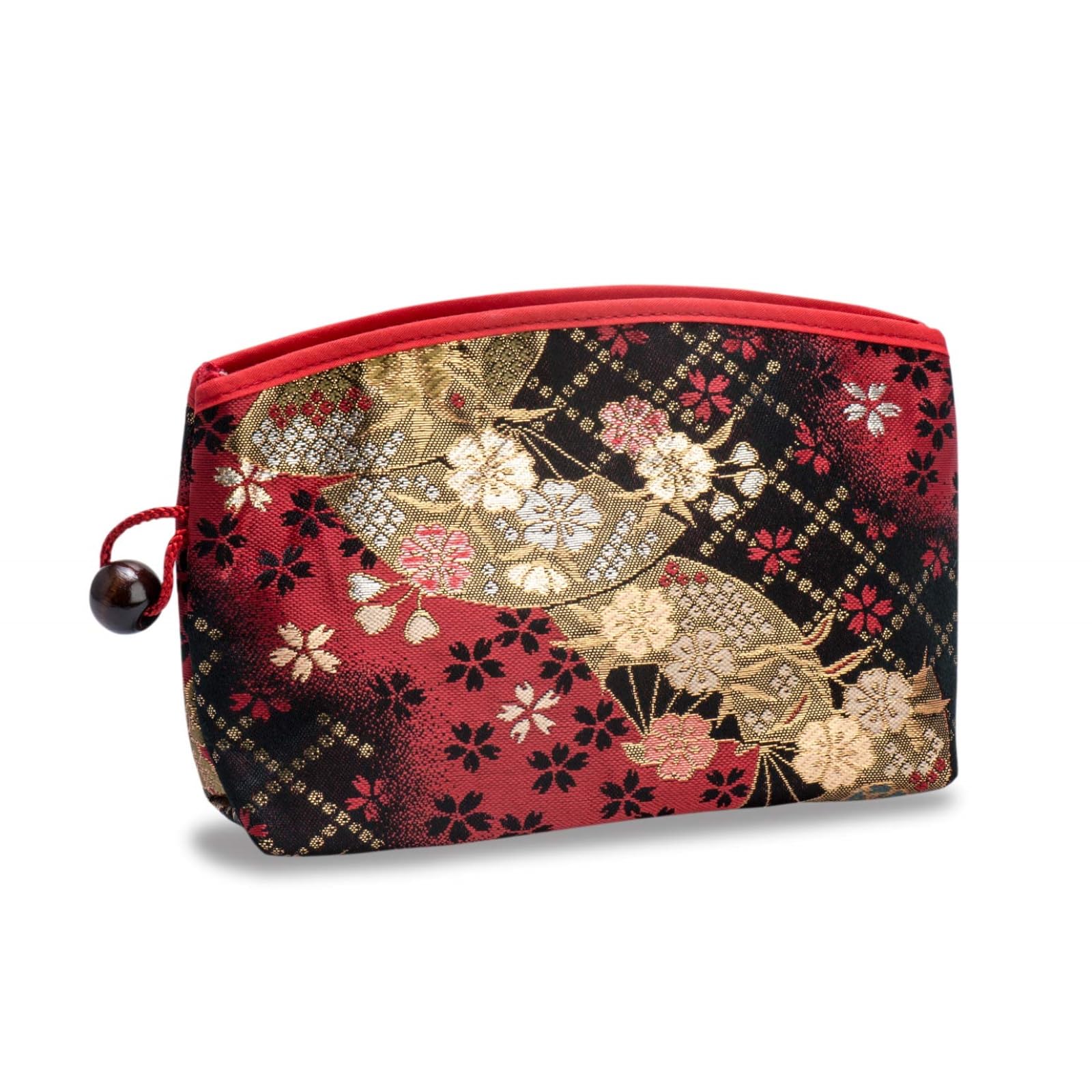 京都芸美堂 西陣織 金襴 化粧ポーチ 和柄 日本製 (黒 扇面 赤)