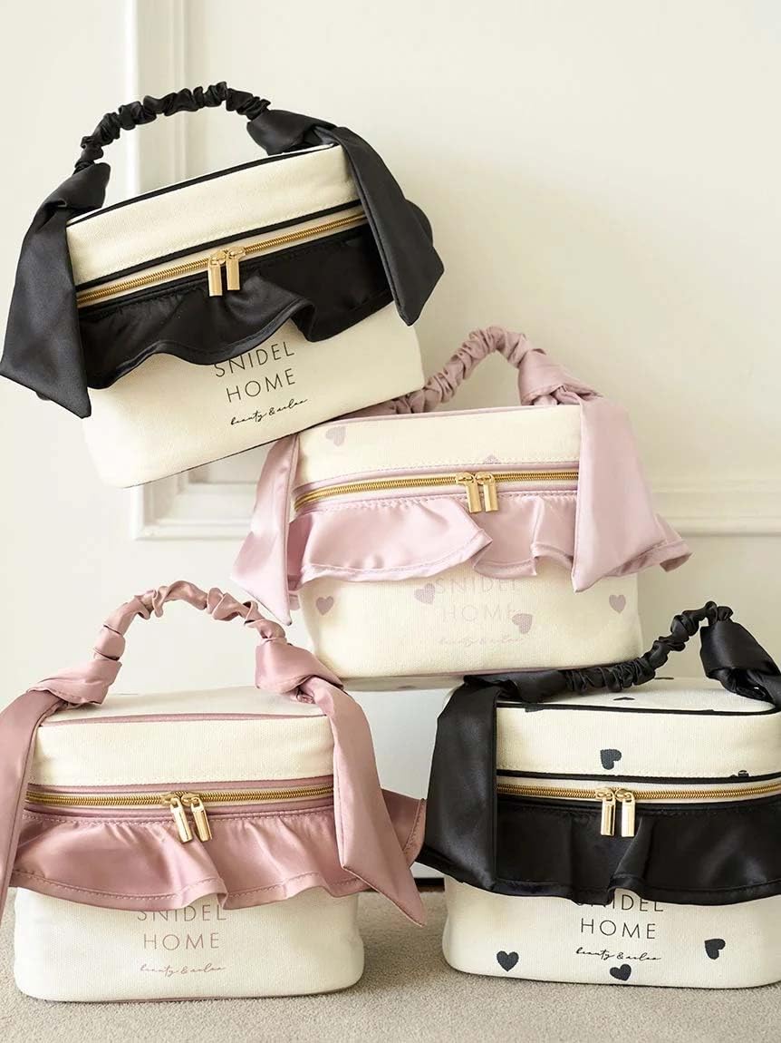 定番オーガニックキャンバスシリーズからバニティポーチが登場 【Design/Styling】 SNIDEL HOME定番のオーガニックコットンのキャンバスシリーズを、バニティポーチに落とし込んだNEWアイテムが誕生しました。 柔らかなギャザーを寄せたリボンハンドル付きの、キャッチーなデザイン。 マチ幅が小さめのスリムな形は狭いスペースにも置けて、スーツケース等にも収まりやすいサイズ感です。 中はリボンと同じカラーリングの裏地を使用し、仕切り付きなのでメイク道具や化粧品を分けて収納できます。 色は定番のブラックとピンクベージュをご用意しました。 ギフトにもおすすめのアイテムです。