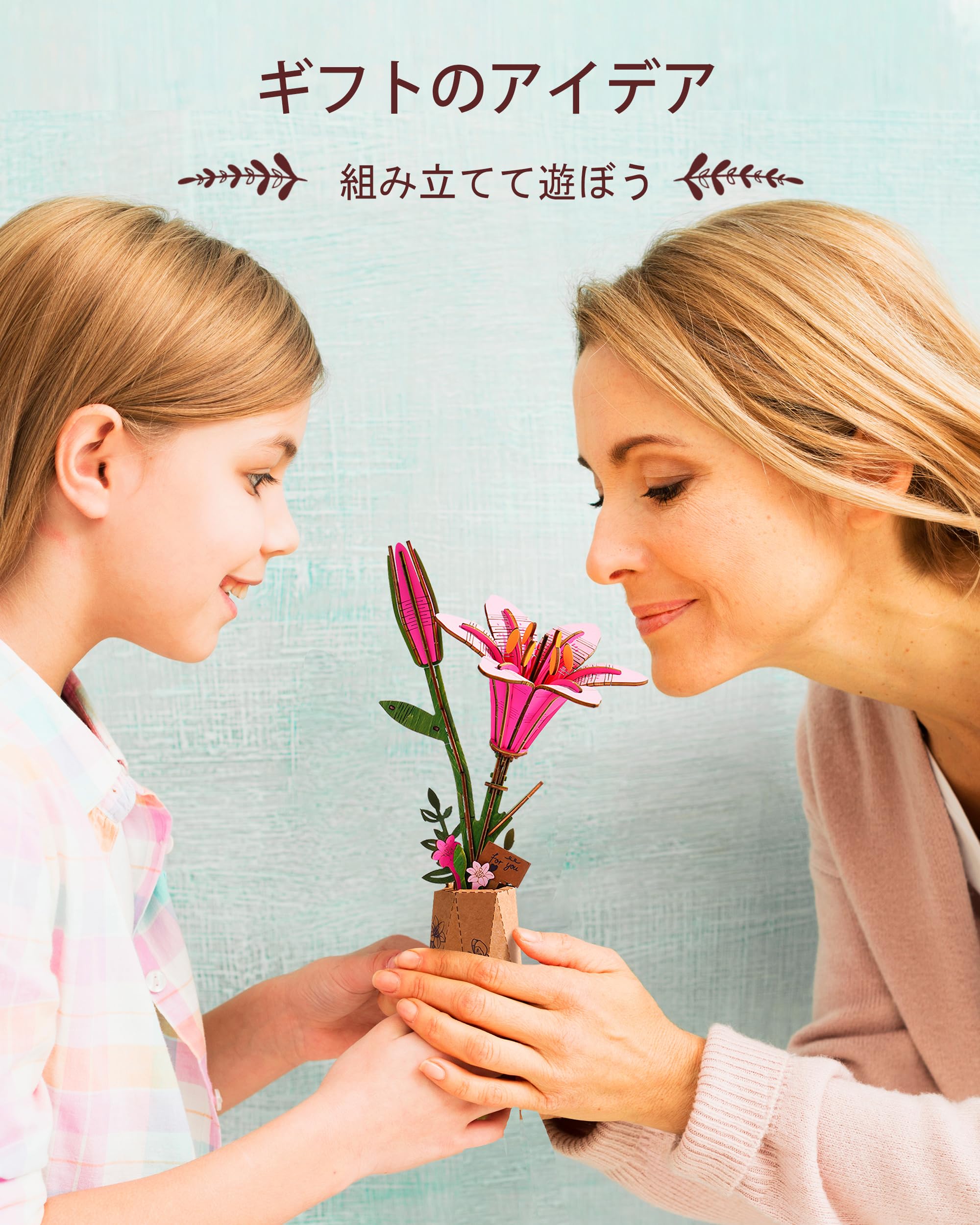 ROKR 立体パズル 花束 ユリ モデル ウッドパズル 初心者向け 組み立てキット DIY クラフト インテリア装飾 雰囲気作り ギフトアイデア 組み立て 暇つぶし 子供向け 大人向け 女の子へのプレゼント バレンタインデー 初心者に最適 知育玩具 (ピンク)