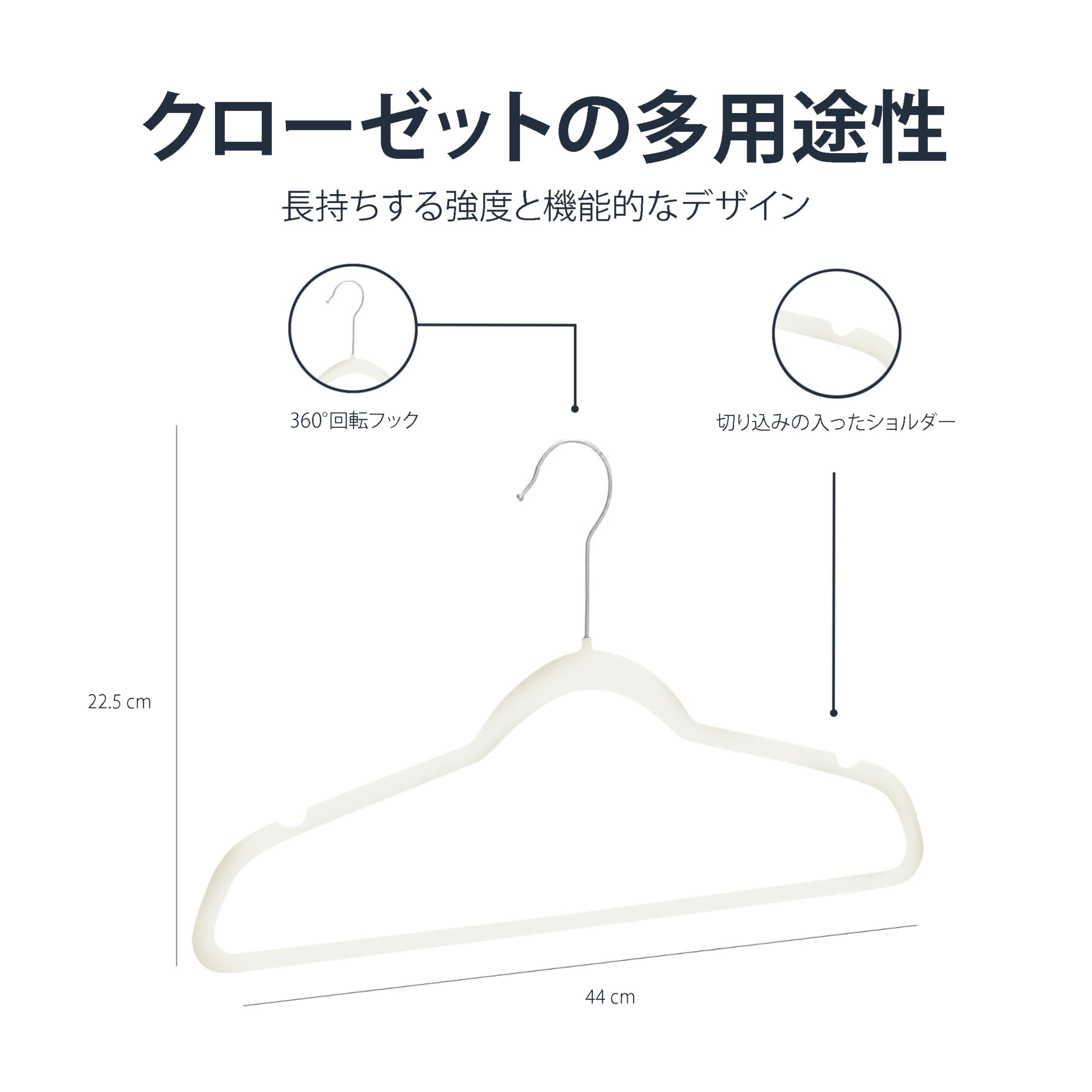 表面のベルベット素材と両肩部分のきりこみが衣類の落下を防ぎます。